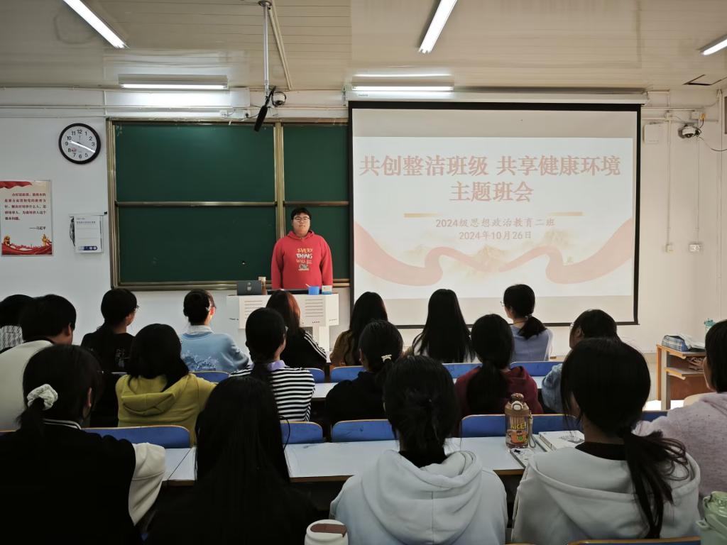 为积极营造整洁、健康的班级环境,提升同学们的环保意识和集体责任感,10 月26日,XCSport2024级思想政治教育二班于社科楼514教室开展了“共创整洁班级,共享健康环境”主题班会。本次班会由班长王志颖主持,二班全体同学共同参与。