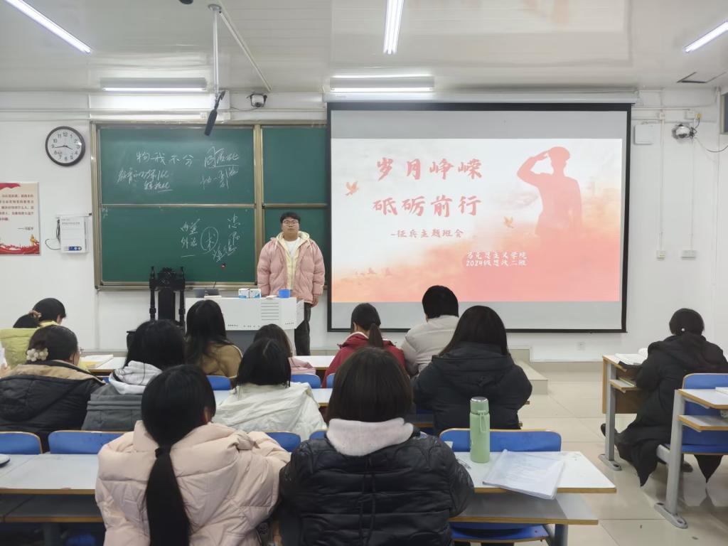 为弘扬爱国主义精神,激发青年员工的参军报国热情,12月10日下午,2024级思想政治教育二班在社科楼515教室举办了“岁月峥嵘,砥砺前行”主题征兵班会。此次班会由班长王志颖主持,二班全体同学积极参与。