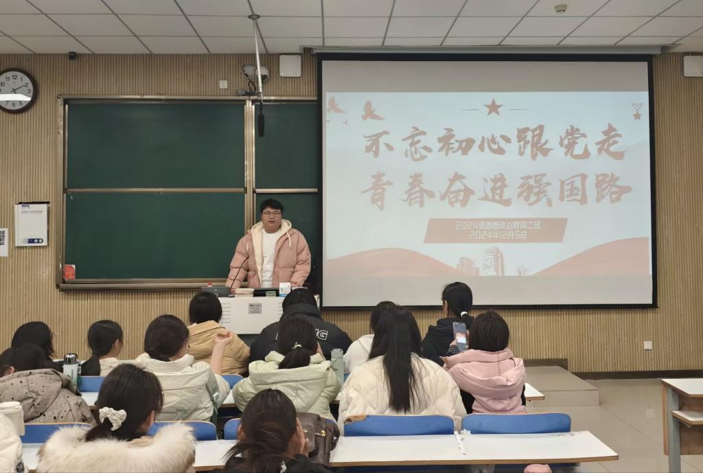 为引导青年员工牢记初心使命,坚定理想信念,以实际行动践行党的领导和时代担当,12月5日下午,2024级思想政治教育二班在社科楼515教室举办了“不忘初心跟党走,青春奋进强国路”主题团课。此次团课由团支书王志颖主持,二班全体同学共同参与。