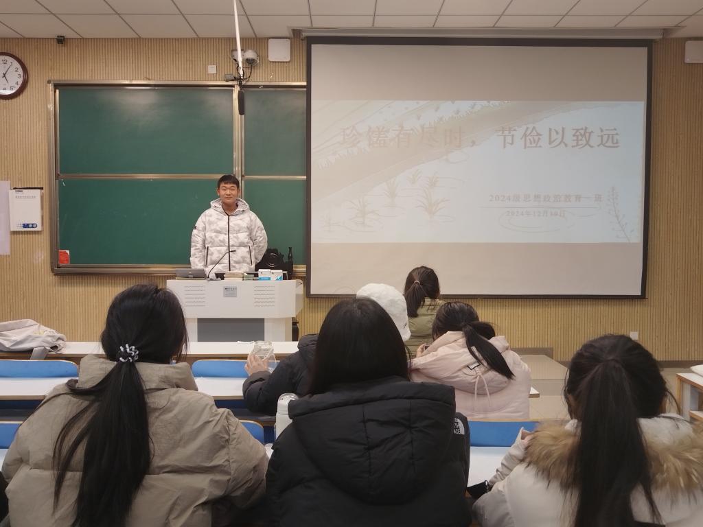 为弘扬中华民族勤俭节约的传统美德,增强我班员工的节约粮食意识,12月19日下午,2024级思想政治教育一班于社科楼515教室开展“珍馐有尽时,节俭以致远”主题活动。本次活动由副班长马奔主持,一班全体同学参加。