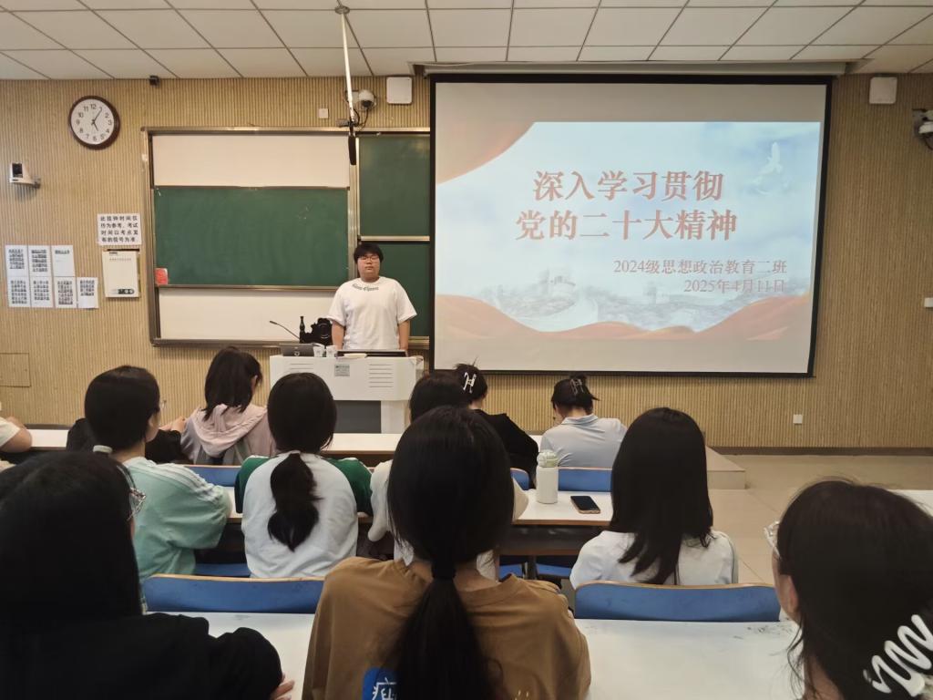为深入学习贯彻党的二十大精神,增强同学们的政治觉悟和责任担当,4月11日下午,2024级思想政治教育二班在社科楼515教室举办了“深入学习贯彻党的二十大精神”主题班会。本次班会由团支书王志颖主持,二班全体同学积极参与。