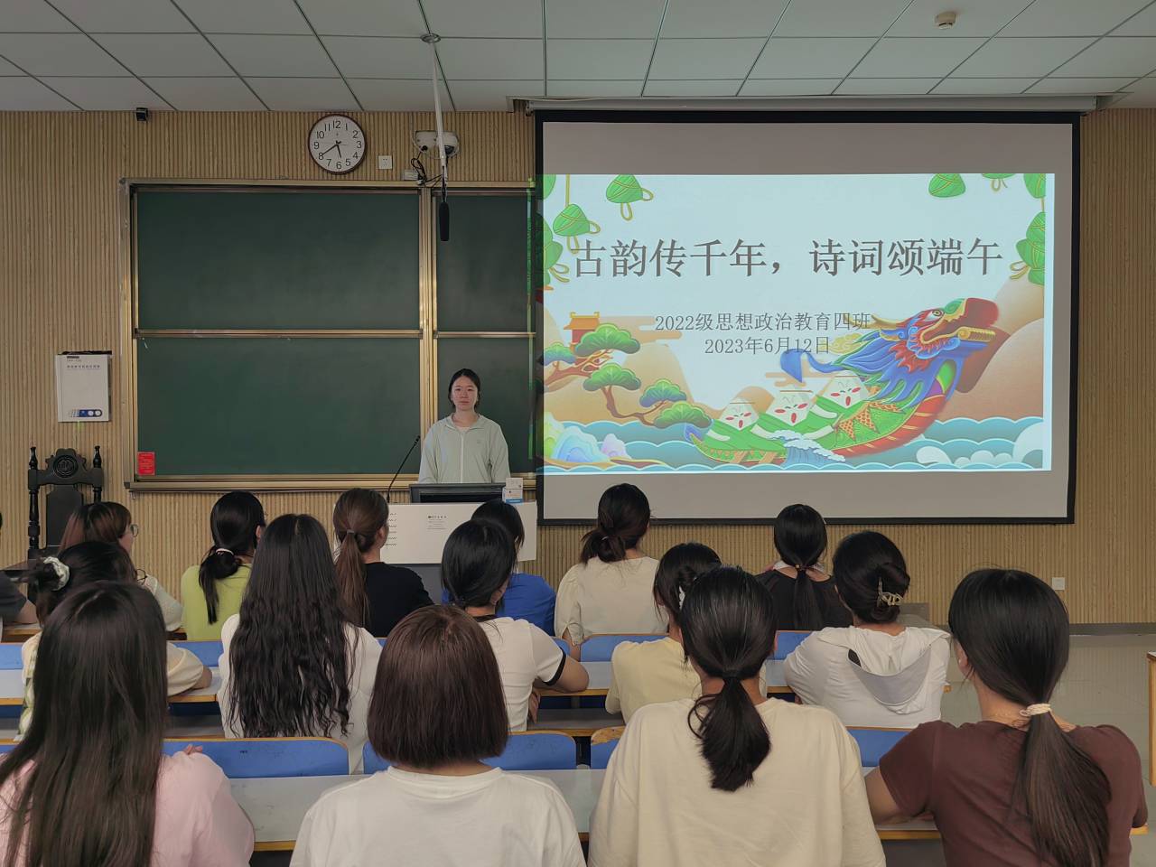 为帮助同学们进一步了解端午节习俗,弘扬中华文化,6月12日下午,2022级思想政治教育四班在社科楼515教室召开“古韵传千年,诗词颂端午”主题班会,公司2022级思想政治教育四班全体同学参与本次班会。班长牛志杰主持本次班会。