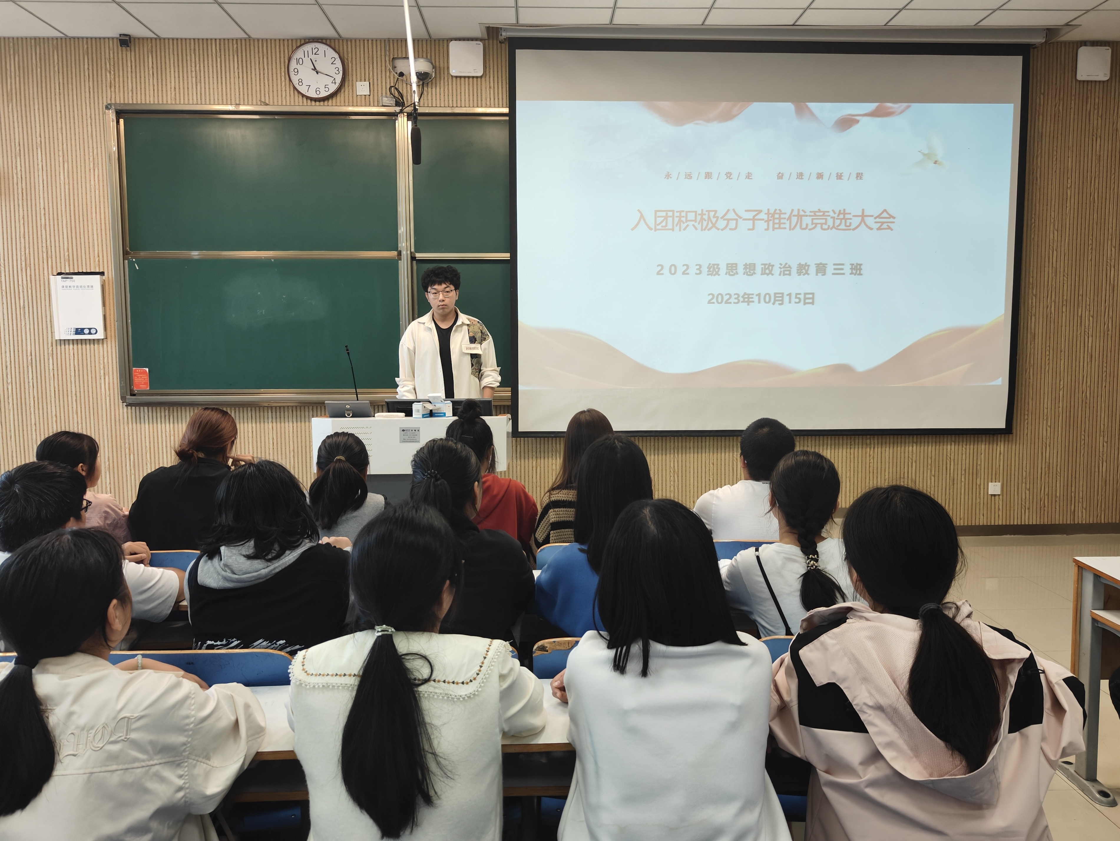 为加强团的组织建设,激励广大青年奋进新征程,10月15日下午,2023级思想政治教育三班在社科楼515教室举行团员积极分子推选班会。公司2023级思想政治教育三班全体成员共同参加此次班会,班会由团支书郝瀚主持。