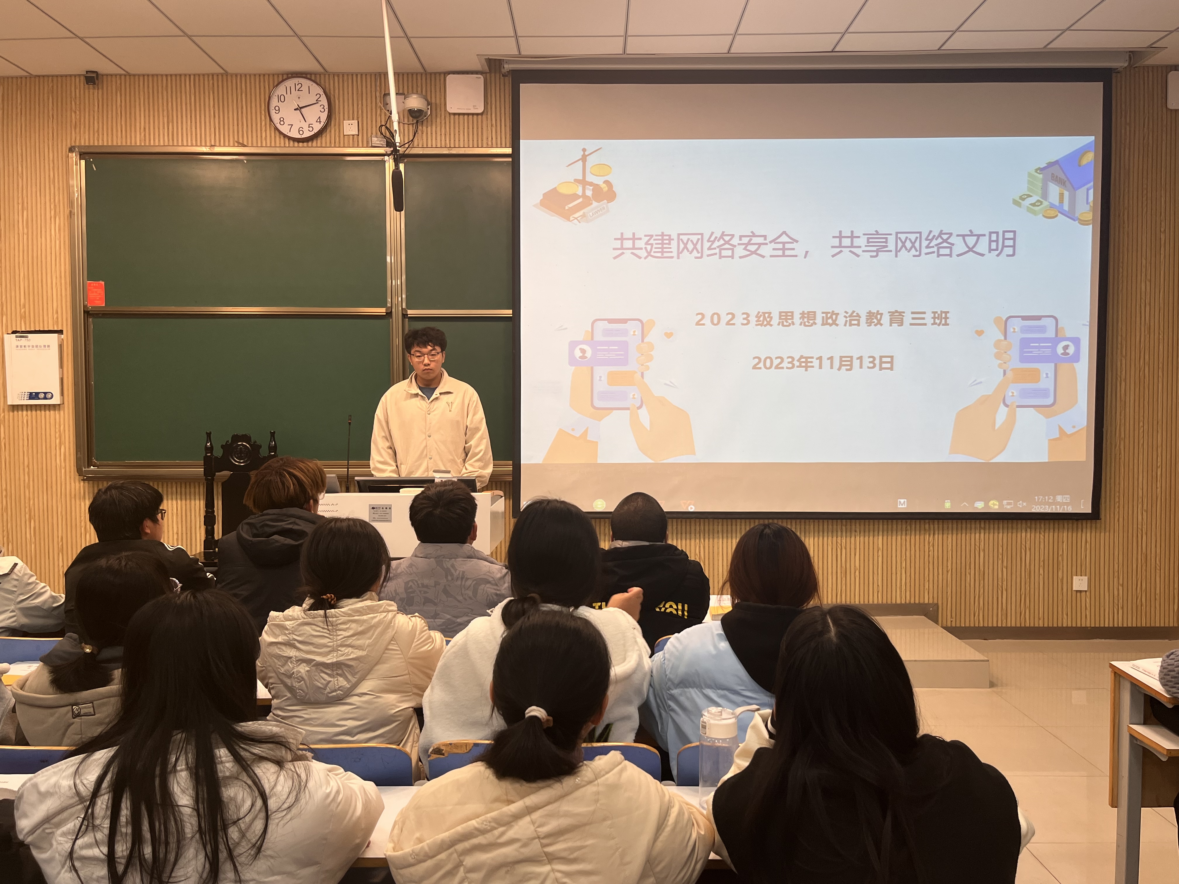 为宣传网络安全知识,避免不法言论对青年学子的误导,11月13日上午,2023级思想政治教育三班在社科楼515教室召开“共建网络安全,共享网络文明”主题团课。公司2023级思想政治教育三班全体成员共同参加此次团课,团课由团支书郝瀚主持。