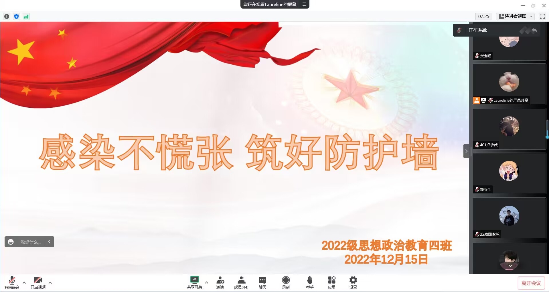 为宣传新形势下的防护政策,缓解同学们的不安情绪,12月15日下午,2022级思想政治教育四班在线上召开“感染不慌张,筑好防护墙”主题班会,2022级思想政治教育四班全体同学参与本次班会。会议由班长牛志杰主持。