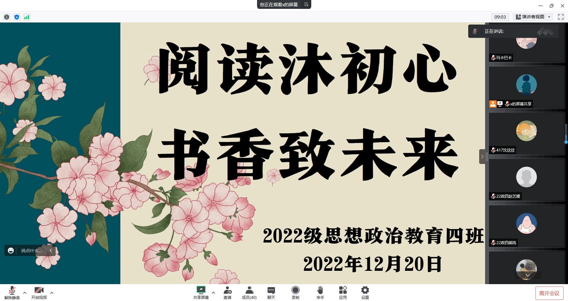 为提高同学们阅读积极性,营造浓厚书香氛围,12月20日下午,2022级思想政治教育四班线上召开“阅读沐初心,书香致未来”主题班会,2022级思想政治教育四班全体同学参与本次班会。会议由学习委员熊祎主持。