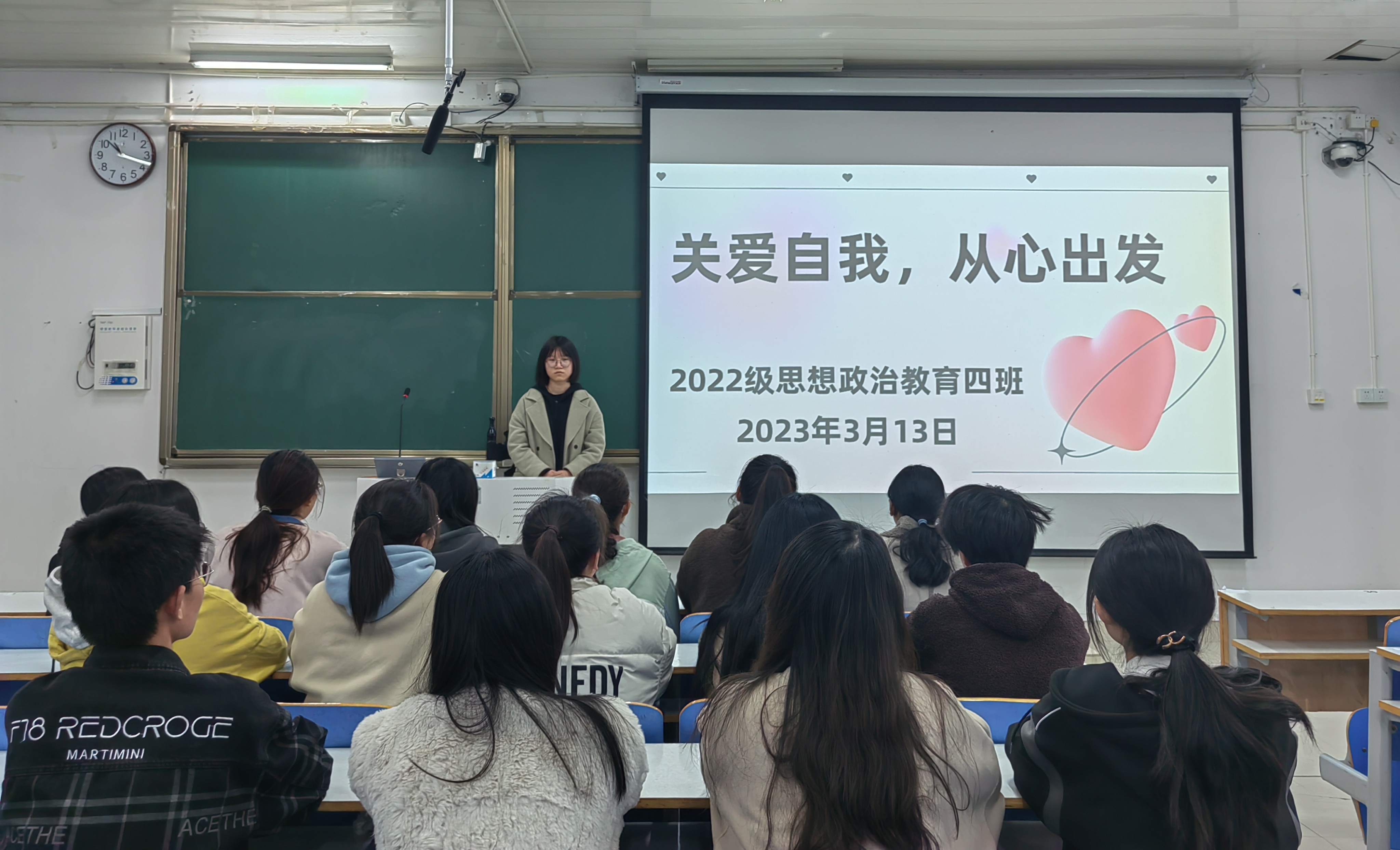 为加强员工心理健康教育,促进其身心和谐发展,3月13日下午,2022级思想政治教育四班在社科楼514教室召开“关爱自我,从心出发”主题班会,2022级思想政治教育四班全体同学参加本次班会。班会由心理委员徐成若主持。