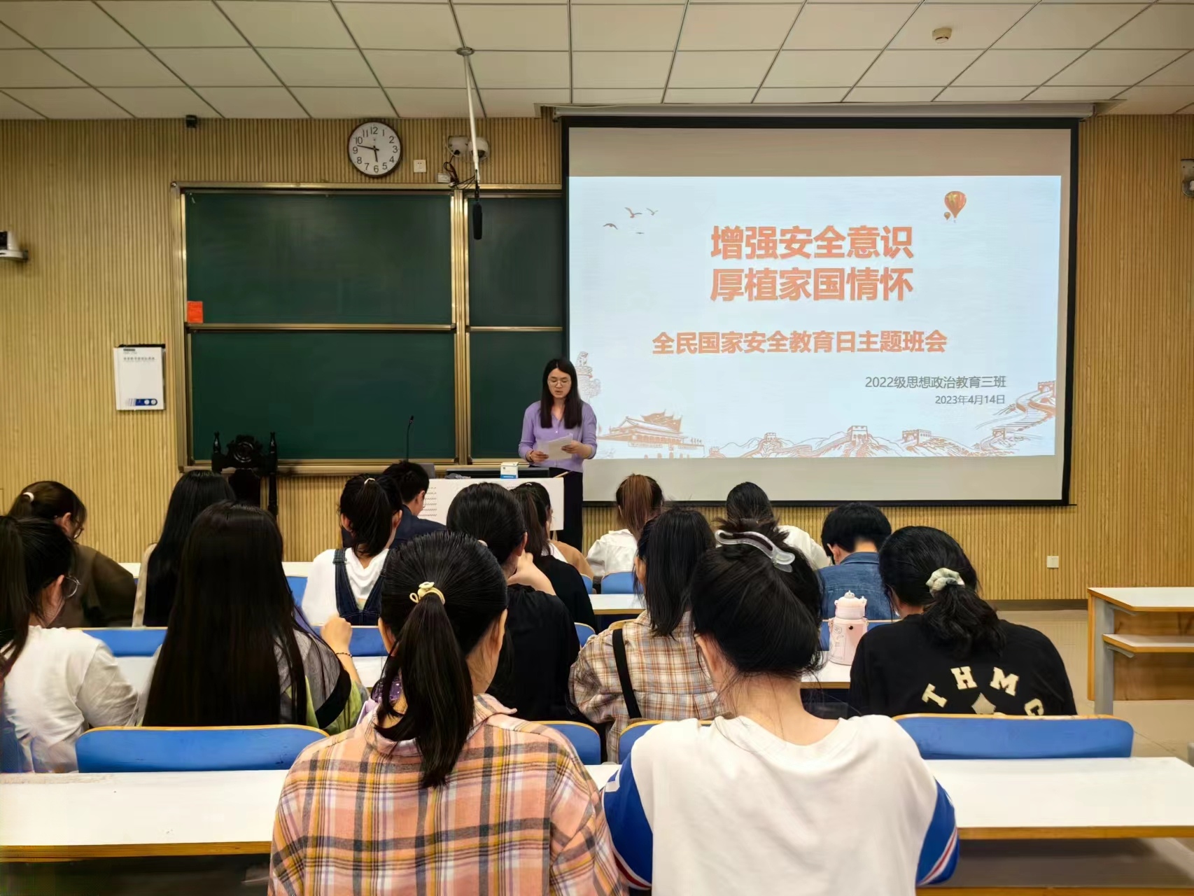 为切实增强广大师生自觉维护国家安全的意识和本领,在第八个全民国家安全教育日来临之际,2022级思想政治教育三班在社科楼515教室召开“增强安全意识,厚植家国情怀”主题班会。公司2022级思想政治教育三班班主任吴梦云以及三班全体同学共同参与此次班会。班会由班长余浩洋主持。