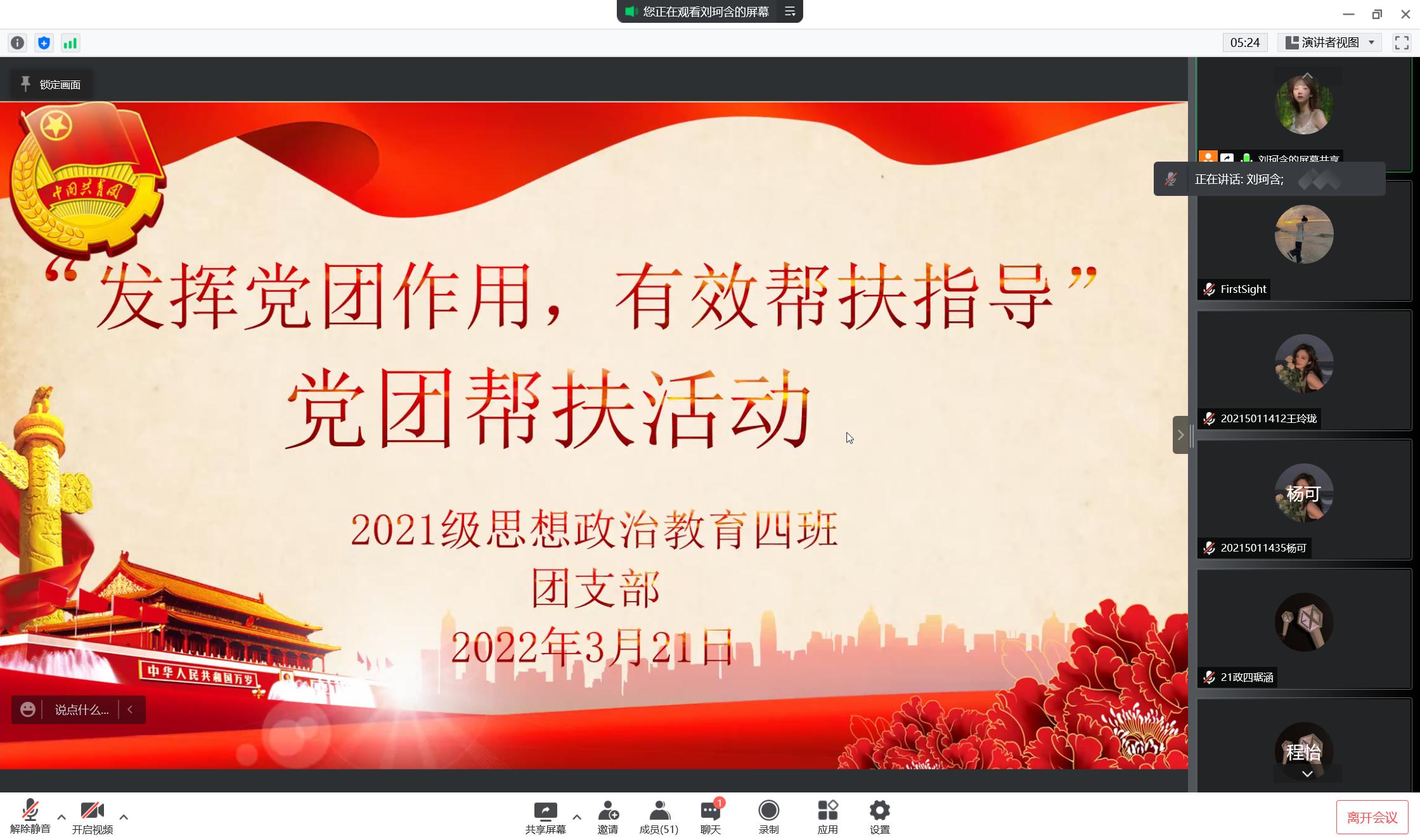 3月21日下午,2021级思想政治教育四班开展线上“发挥党团作用,有效帮扶指导”党团帮扶活动。辅导员高小佳、预备党员王晓鹭、姚勇毅及2021级思想政治教育四班全体团员共同参加此次活动。活动由团支书刘珂含主持。