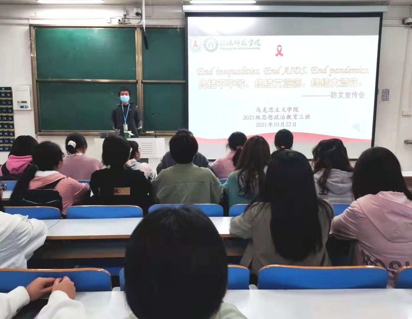 为加深同学们对艾滋病的了解,消除对艾滋病患者的偏见,提高社会责任感。10月22日下午,2021级思想政治教育三班在社科楼515组织开展防艾宣传会。2021级思想政治教育三班全体同学共同参加。会议由团支书郭少华和副班长王岚霄主持。
