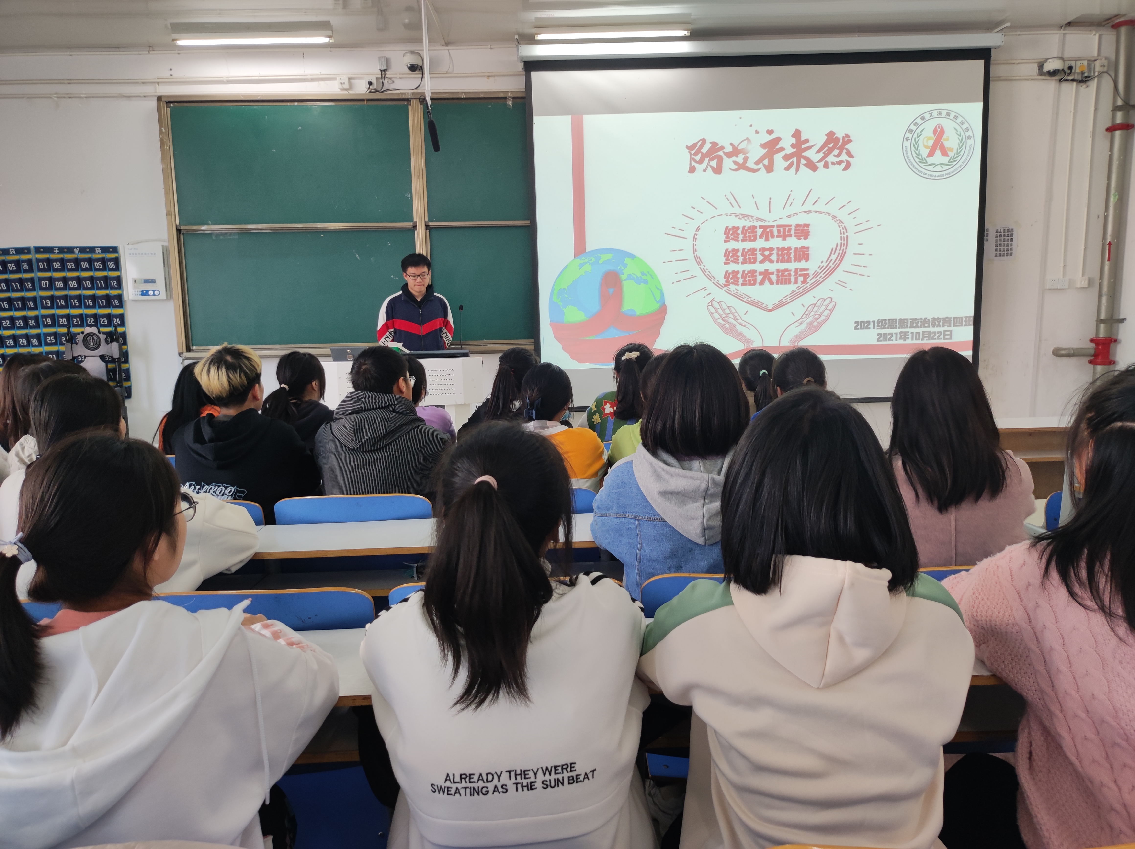 为了提高同学们对艾滋病的认识,10月27日上午,2021级思想政治教育四班“预防艾滋病”主题班会在社科楼514教室顺利开展。2021级思想政治教育四班全体同学参加了本次班会。班会由副班长常康哲主持。