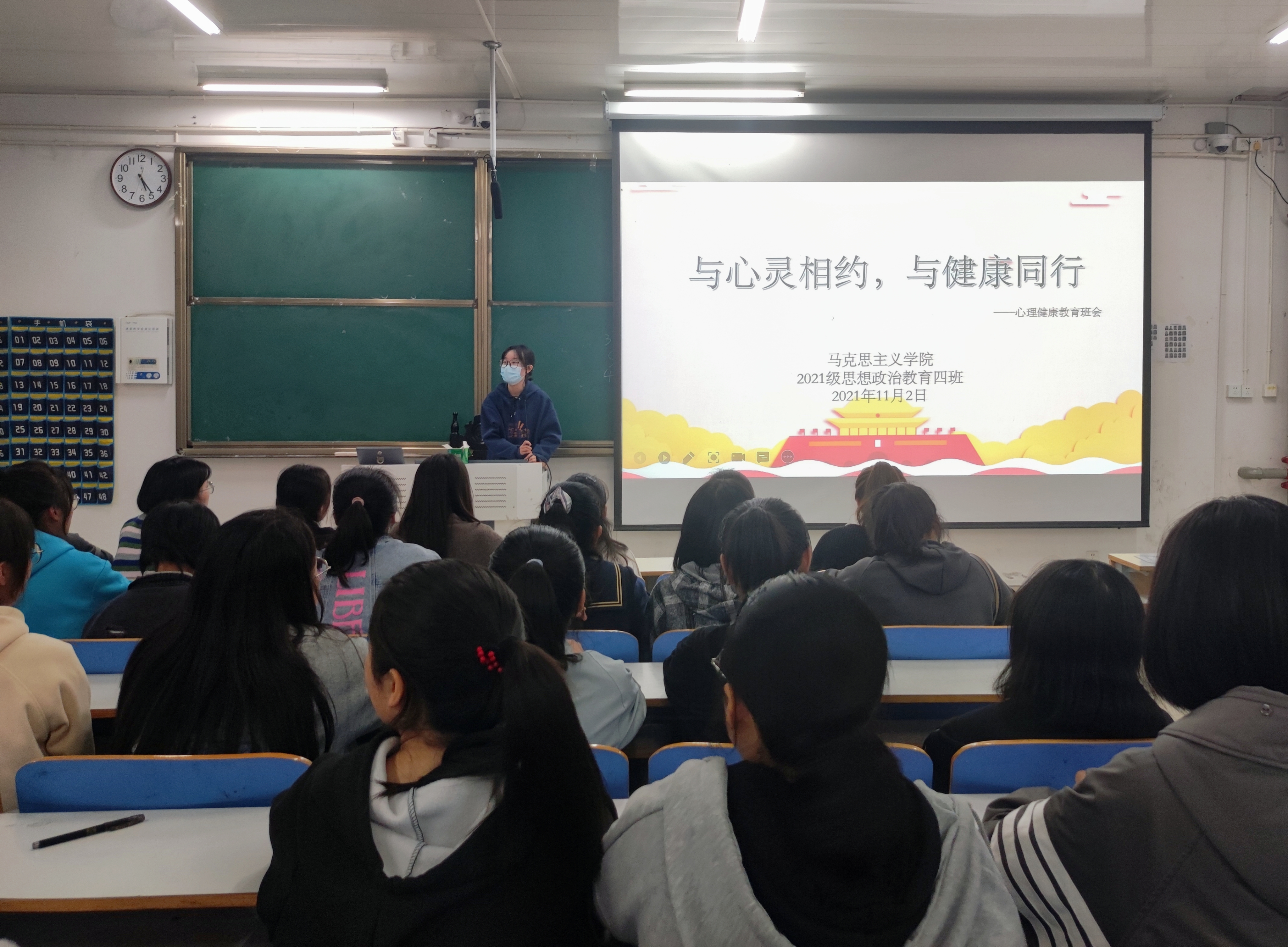 为了普及心理知识,营造班级良好氛围。11月2日上午,2021级思想政治教育四班“与心灵相约,与健康同行”主题班会在社科楼516教室顺利开展。2021级思想政治教育四班全体同学参加了本次班会。班会由心理委员杨可主持。