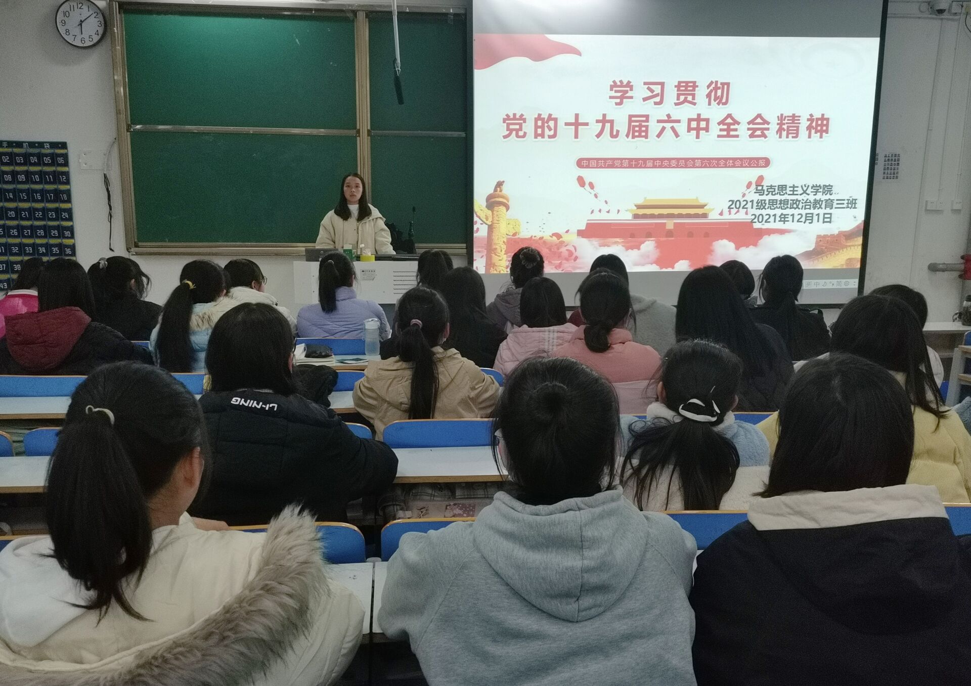 12月1日下午,2021级思想政治教育三班在社科楼516召开学习党的十九届六中全会精神主题班会。2021级思想政治教育三班全体成员参加本次班会。班会由副班长王岚霄主持。