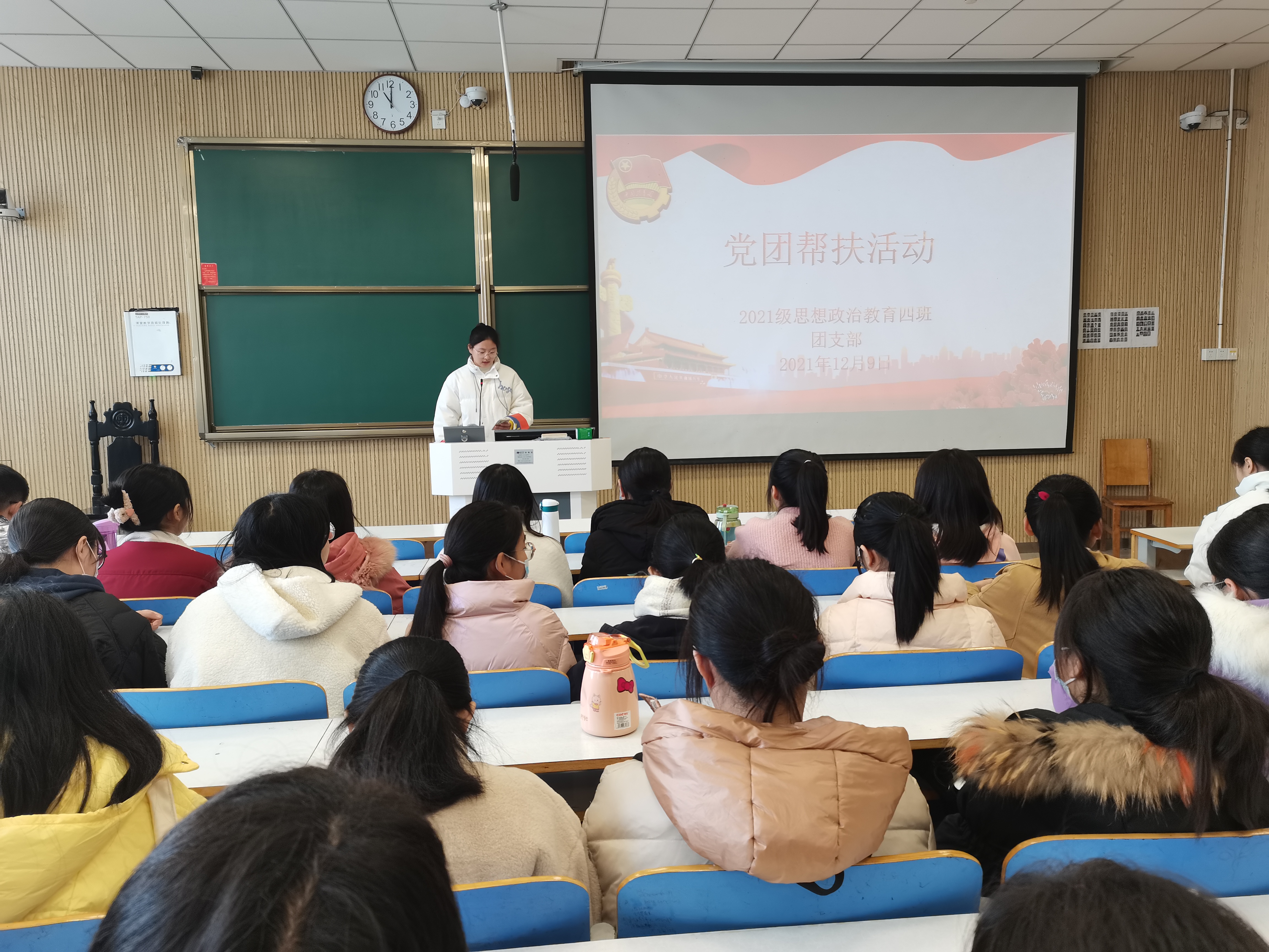 12月9日上午,2021级思想政治教育四班在社科楼515教室召开党团帮扶活动。辅导员高小佳、2018级思想政治教育一班的李东琴、韩一嘉及2021级思想政治教育四班全体团员参加此次活动。活动由团支书刘珂含主持。