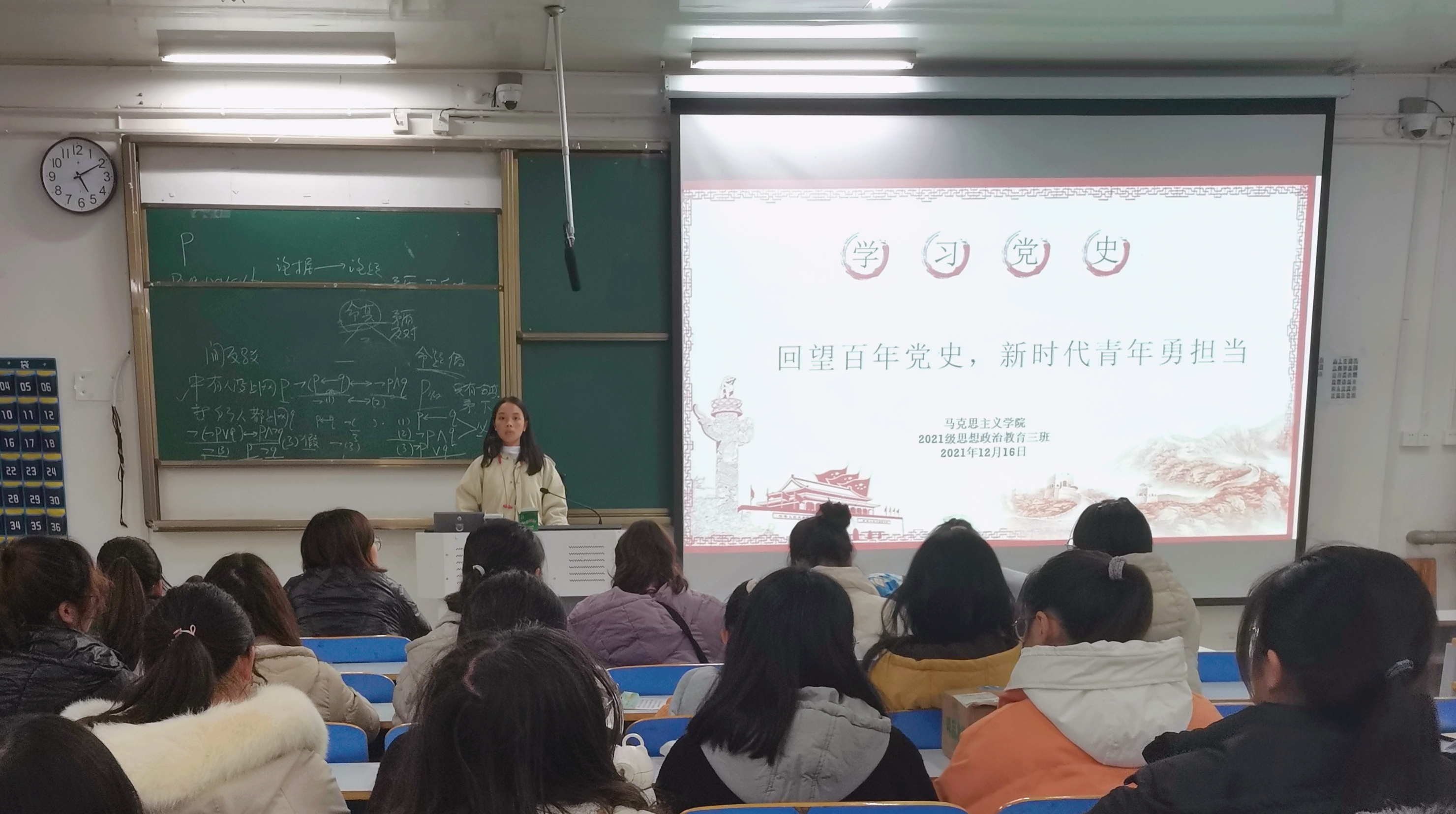 12月16日下午,2021级思想政治教育三班在社科楼514教室举办“回望百年党史,新时代青年勇担当”主题团课。2021级思想政治教育三班全体团员参加了此次团课。团课由团支部副书记王岚霄主持。