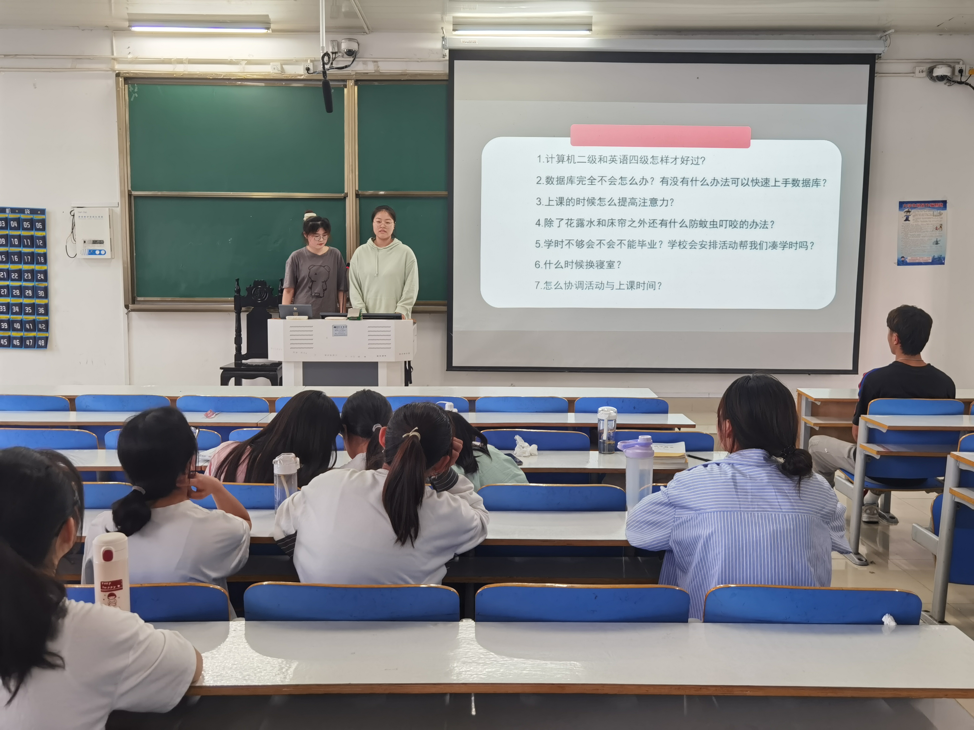 首先,陈宇航利用幻灯片向大家展示同学们提出的各类问题。随后,预备党员王文慧、李静结合自身学习与生活经验,悉心为大家解惑。其中,针对如何学好数据库、通过计算机二级和英语四级考试这类问题,李静表示,同学们要注意平时积累,做到理论知识与实际操作相结合,提前复习为考试做好准备。对于共青团员如何向党组织靠拢的问题,王文慧对我班员工提出四点建议:一要积极主动地向党组织汇报个人思想状况;二要积极参加党组织的各种有关活动,认真对待党组织的培养教育;三要自觉接受并正确对待党组织的考察;四要加强理论学习,树立坚定的共产主义理想信念。接着,王文慧根据同学们的需求为大家推荐《共产党宣言》、《关于费尔巴哈的提纲》和《资本论》等几本专业性较强的书籍,并为同学们提供相关的解读资料帮助员工阅读。最后,陈宇航对本次活动进行总结并对王文慧、李静的耐心解答表示感谢。