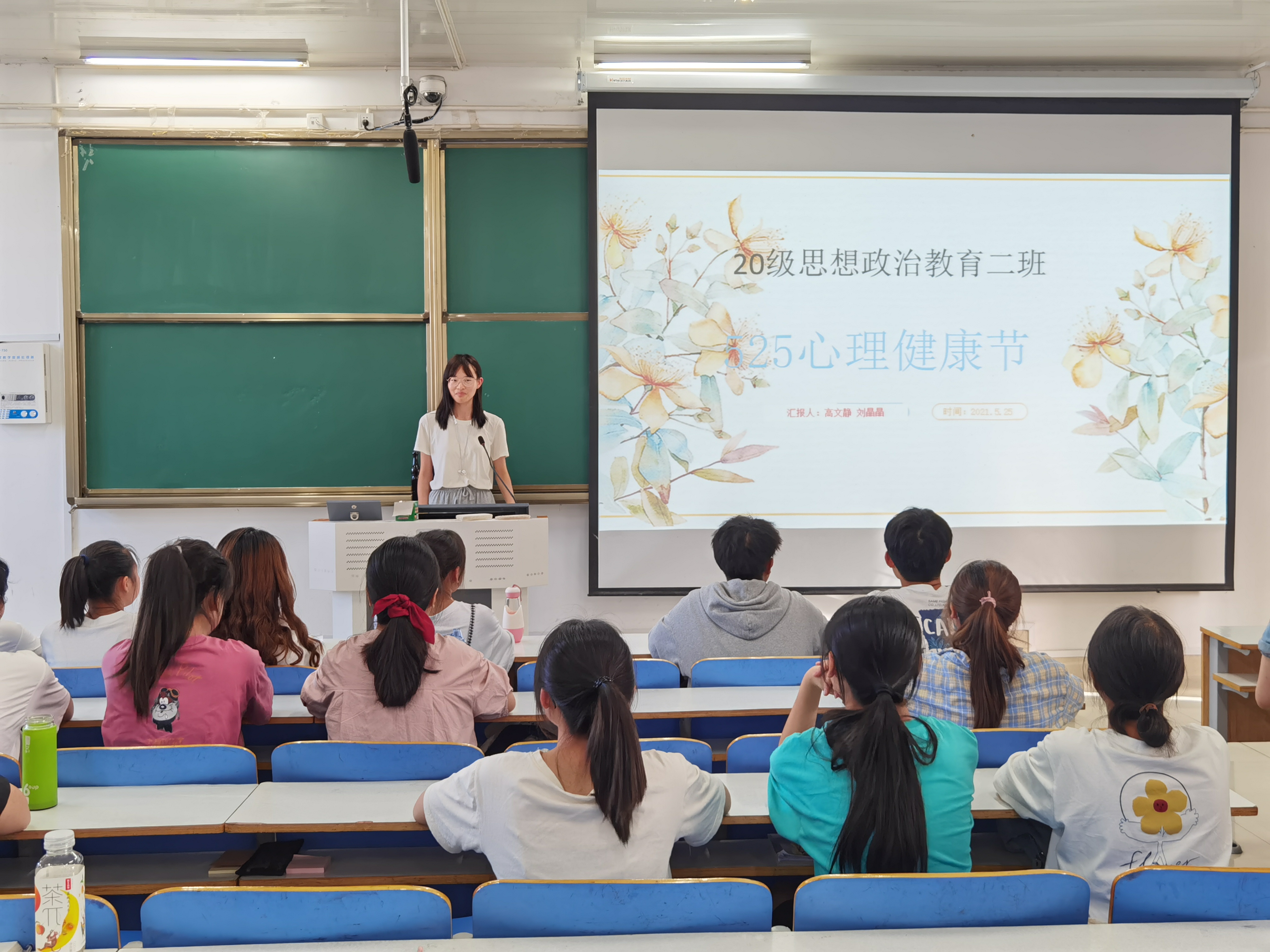 为大力营造“525,我爱我”节日氛围,进一步提高我班同学对自身心理健康的关注程度,5月25日下午,2020级思想政治教育二班、定向二班“525心理健康节”主题班会在社科楼514教室顺利召开。二班、定向二班全体员工参与班会。班会由心理委员刘晶晶、高文静主持。