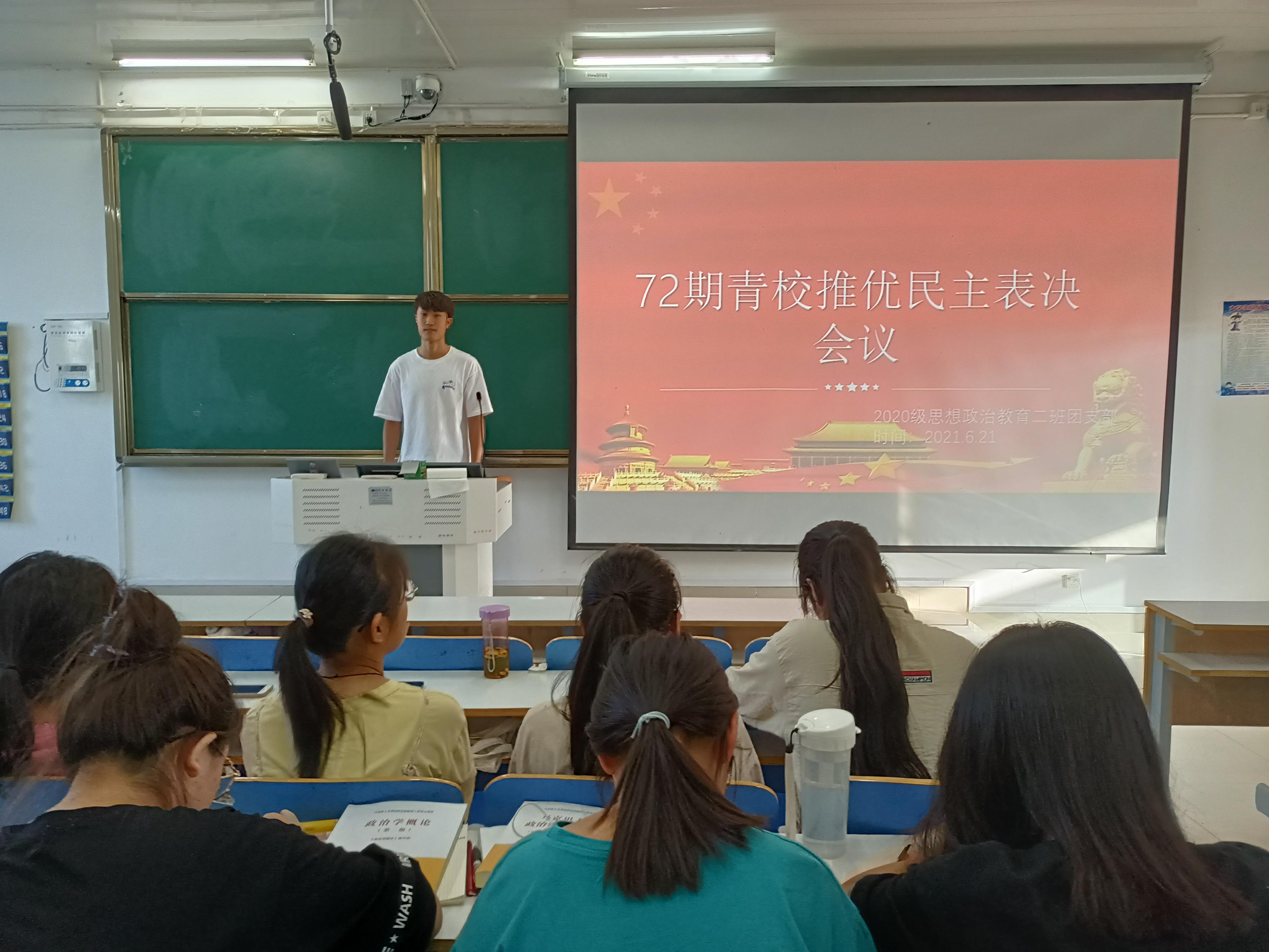 6月21日下午,2020级思想政治教育二班在社科楼514教室顺利召开第72期青校学员推优民主表决团支部大会。2020级思想政治教育二班全体团员共同参与本次会议。