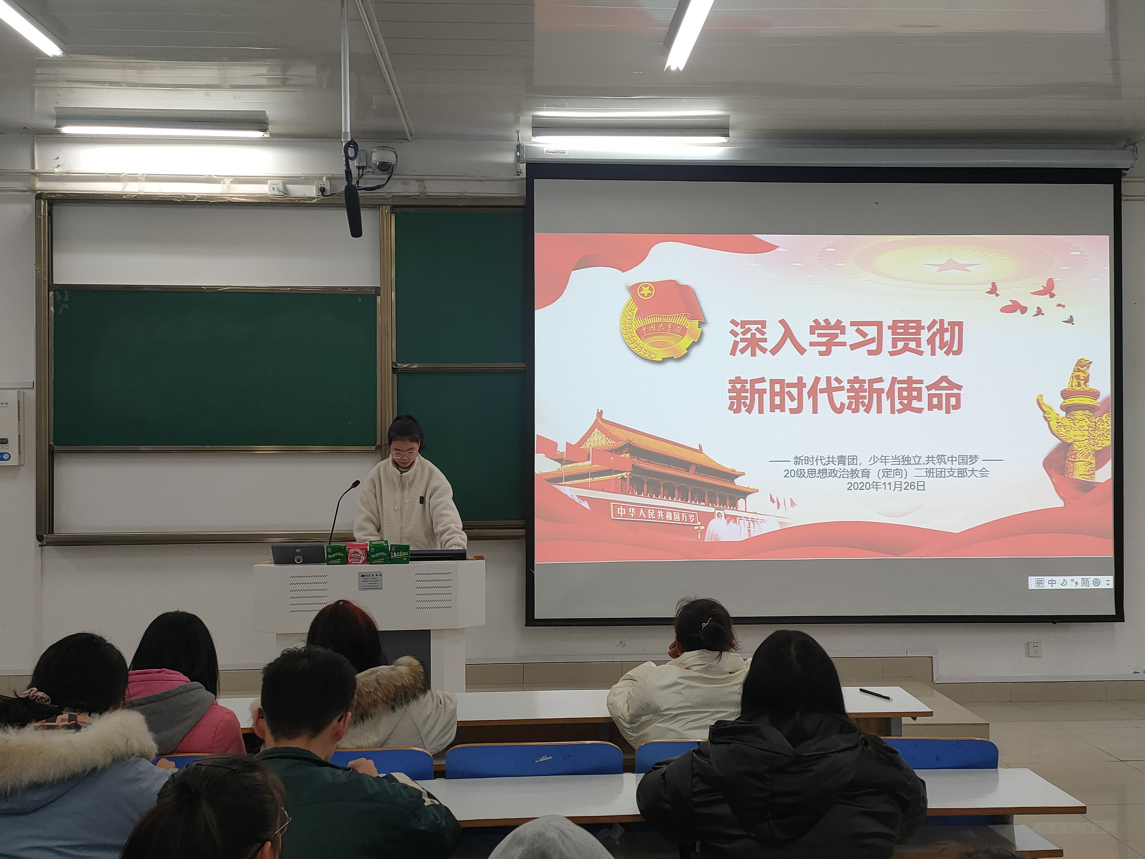 为促进同学们深入学习共青团知识,自觉担当新时代新使命,11月26日,2020级思想政治教育定向二班“担当新使命,共筑中国梦”主题团支部大会在社科楼514教室顺利召开。定向二班全体团员参与此次会议。大会由团支书李晨曦主持。