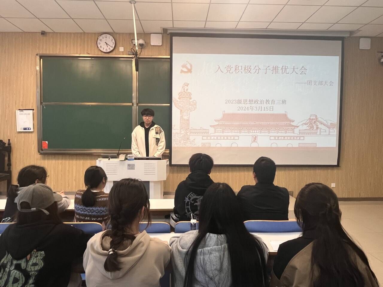为加强党的队伍建设,充实党的新生力量,3月15日上午,XCSport2023级思想政治教育三班在社科楼515教室举行入党积极分子推优大会。公司2023级思想政治教育三班全体成员共同参加此次班会,班会由团支书郝瀚主持。