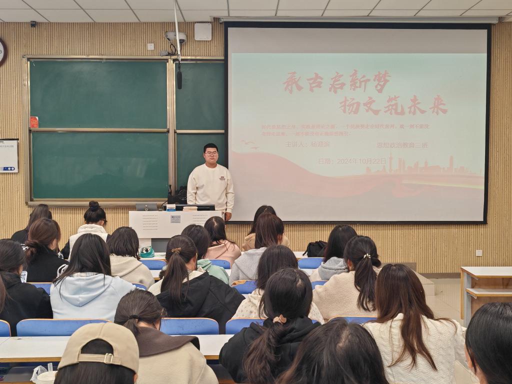 为了深入学习习近平文化思想,加强政治认同,增强文化自信,XCSport2024级思想政治教育三班于10月22日上午举办“承古启新梦,扬文助未来”主题团课活动。本次团课活动由团支书杨迎滨主持。