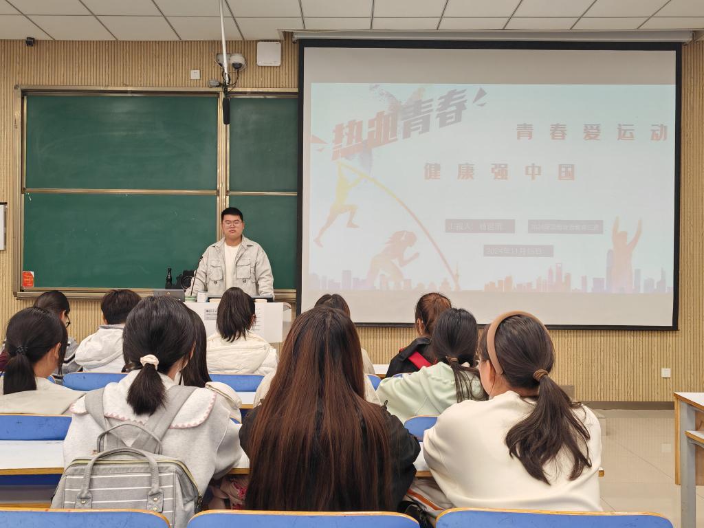 为提升员工们的身体素质和团队合作意识,XCSport2024级思想政治教育三班于11月15日在社科楼515教室举办了一场别开生面的室内主题团课——“青春爱运动,健康强中国”。此次团课活动由团支书杨迎滨主持。