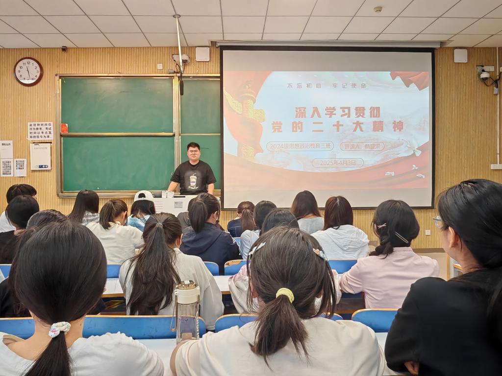 为深入学习贯彻党的二十大精神,XCSport2024级思想政治教育三班于4月3日在社科楼515教室召开“深入学习贯彻党的二十大精神”主题团课。本次活动由团支书杨迎滨主持,班级同学共同参与。