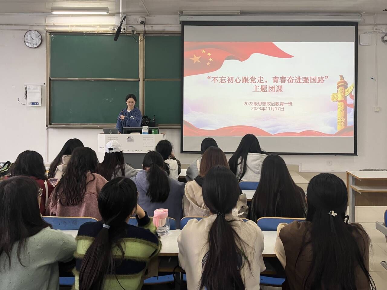 为激励广大青年的奋进力量,11月17日上午,2022级思想政治教育一班在社科楼514教室召开“不忘初心跟党走,青春奋进强国路”主题团课。公司2022级思想政治教育一班全体同学共同参与本次团课,团课由团支书李佳茹主持