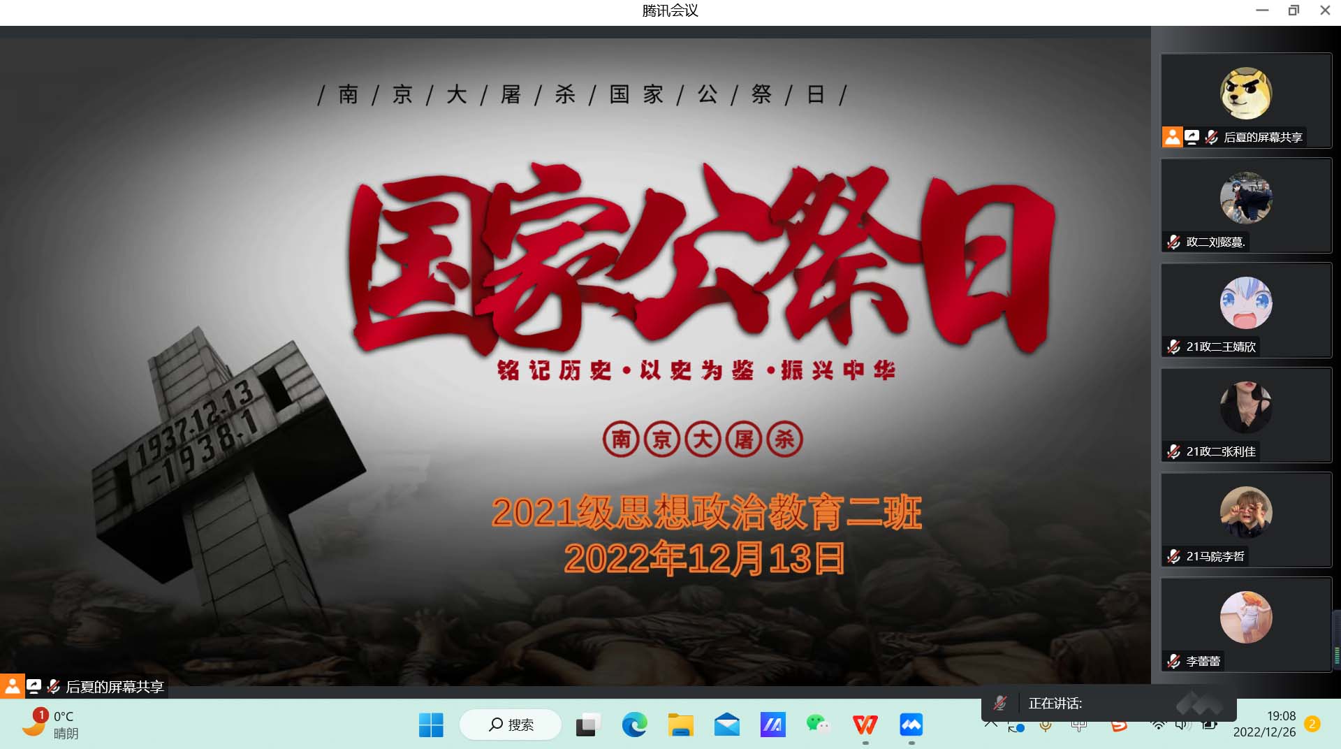 12月13日下午,2021级思想政治教育二班在腾讯会议召开“铭记历史·以史为鉴·振兴中华”国家公祭日主题班会。2021级思想政治教育二班全体成员共同参加此次班会。班会由团支书王婧欣主持。