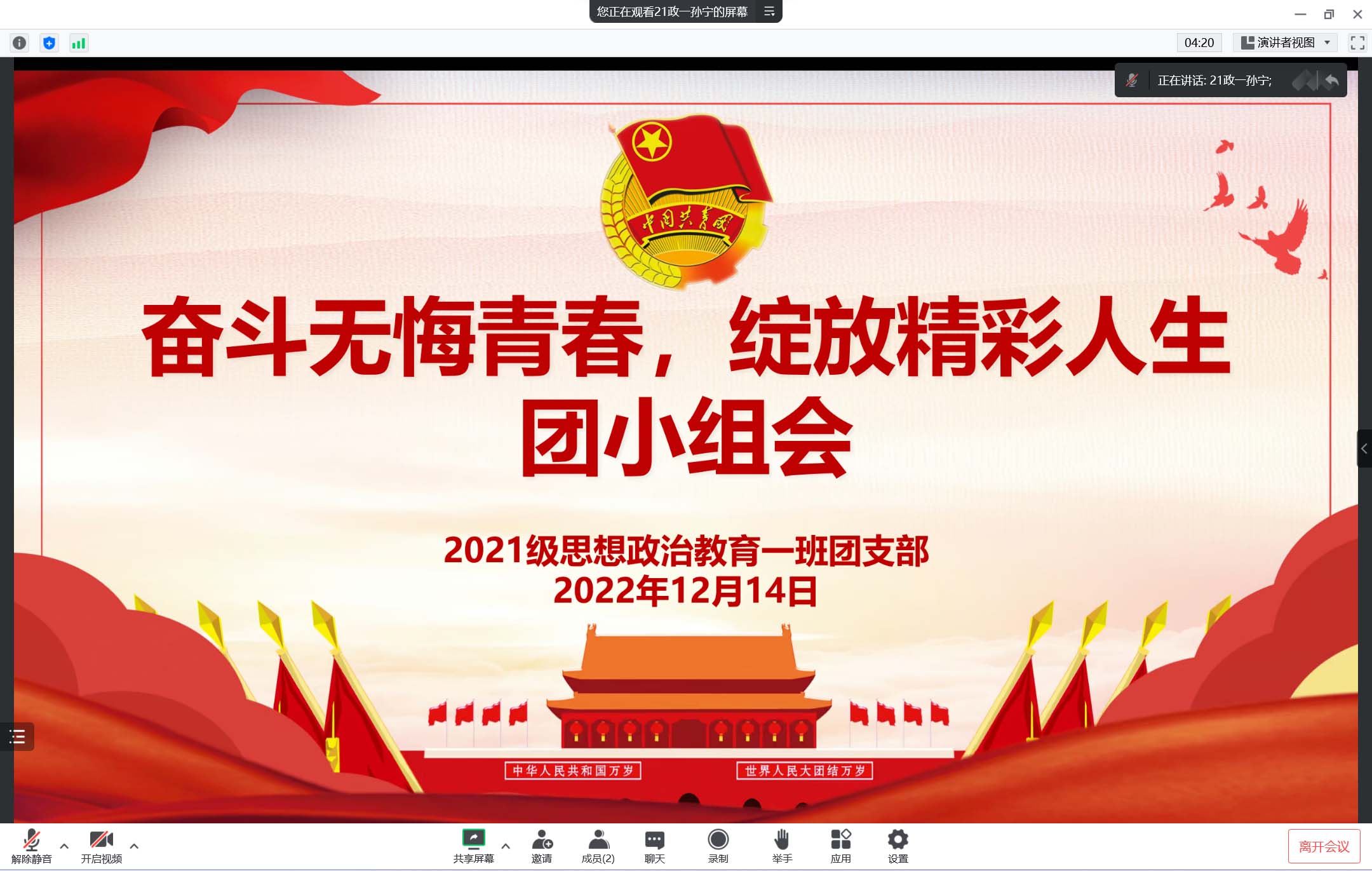 为激励当代青年们开拓创新、分秒必争、奋勇拼搏,12月14日下午,2021级思想政治教育一班团支部第二团小组在腾讯会议召开线上“奋斗无悔青春,绽放精彩人生”团小组会。2021级思想政治教育一班团支部第二团小组全体成员共同参加了本次会议。会议由第二团小组组长孙宁主持。