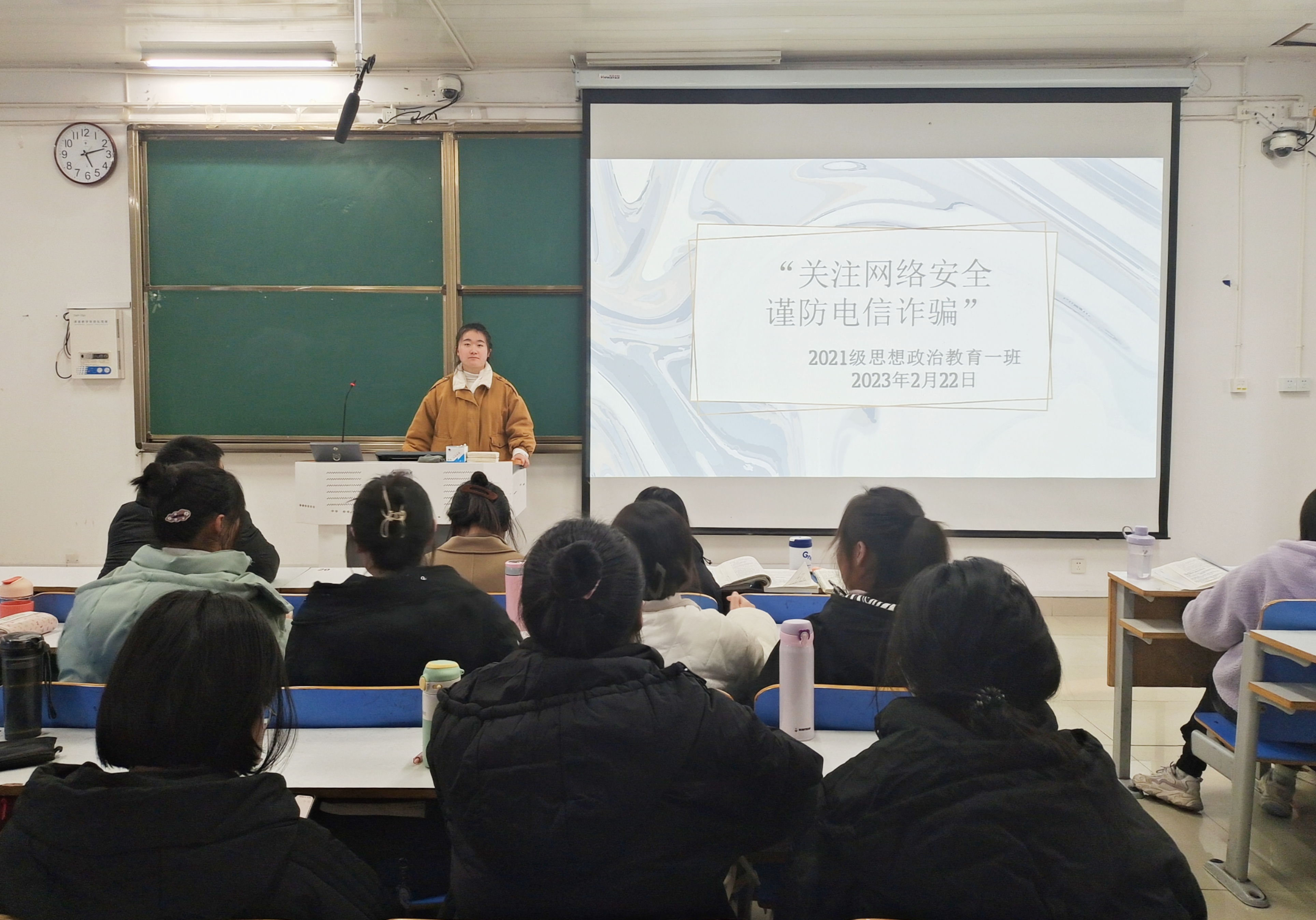 为进一步提高同学们对电信网络诈骗的防范意识,增强防范网络诈骗能力。2月22日下午,2021级思想政治教育一班在社科楼514教室召开“关注网络安全,谨防电信诈骗”主题班会。2021级思想政治教育一班全体成员共同参加本次班会。班会由副班长雷敏主持。