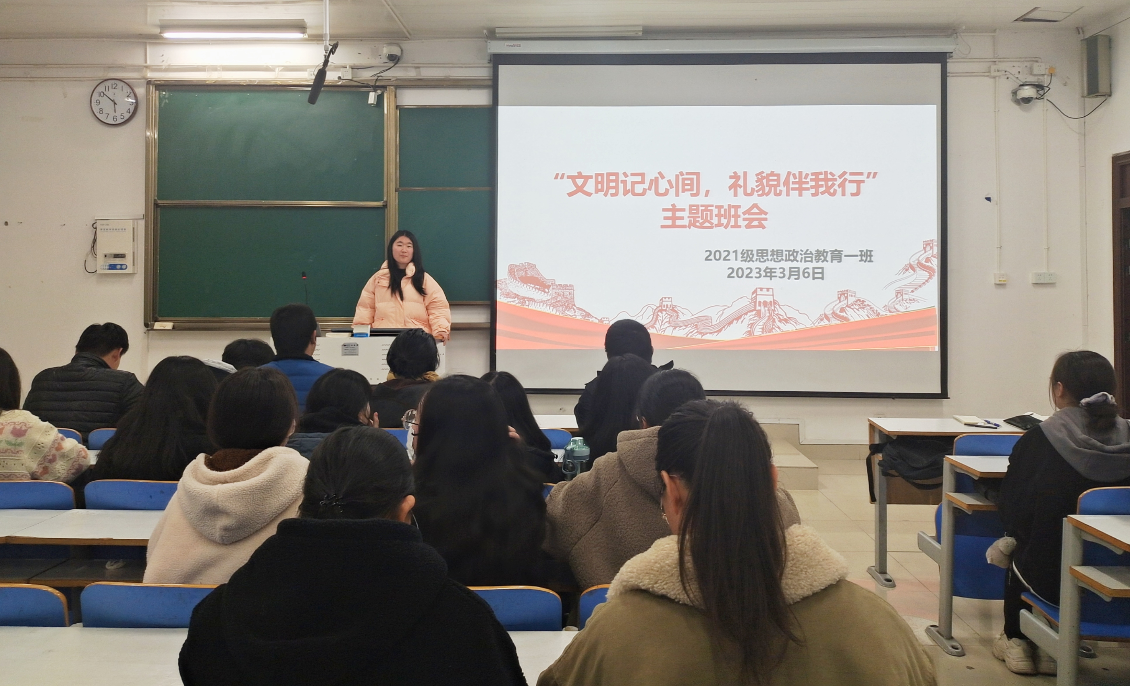 为加强校园文明建设,增强员工文明意识,营造文明、和谐的育人环境。3月6日下午,2021级思想政治教育一班在社科楼514教室召开“文明记心间,礼貌伴我行”主题班会。2021级思想政治教育一班全体成员共同参与本次班会。班会由副班长雷敏主持。