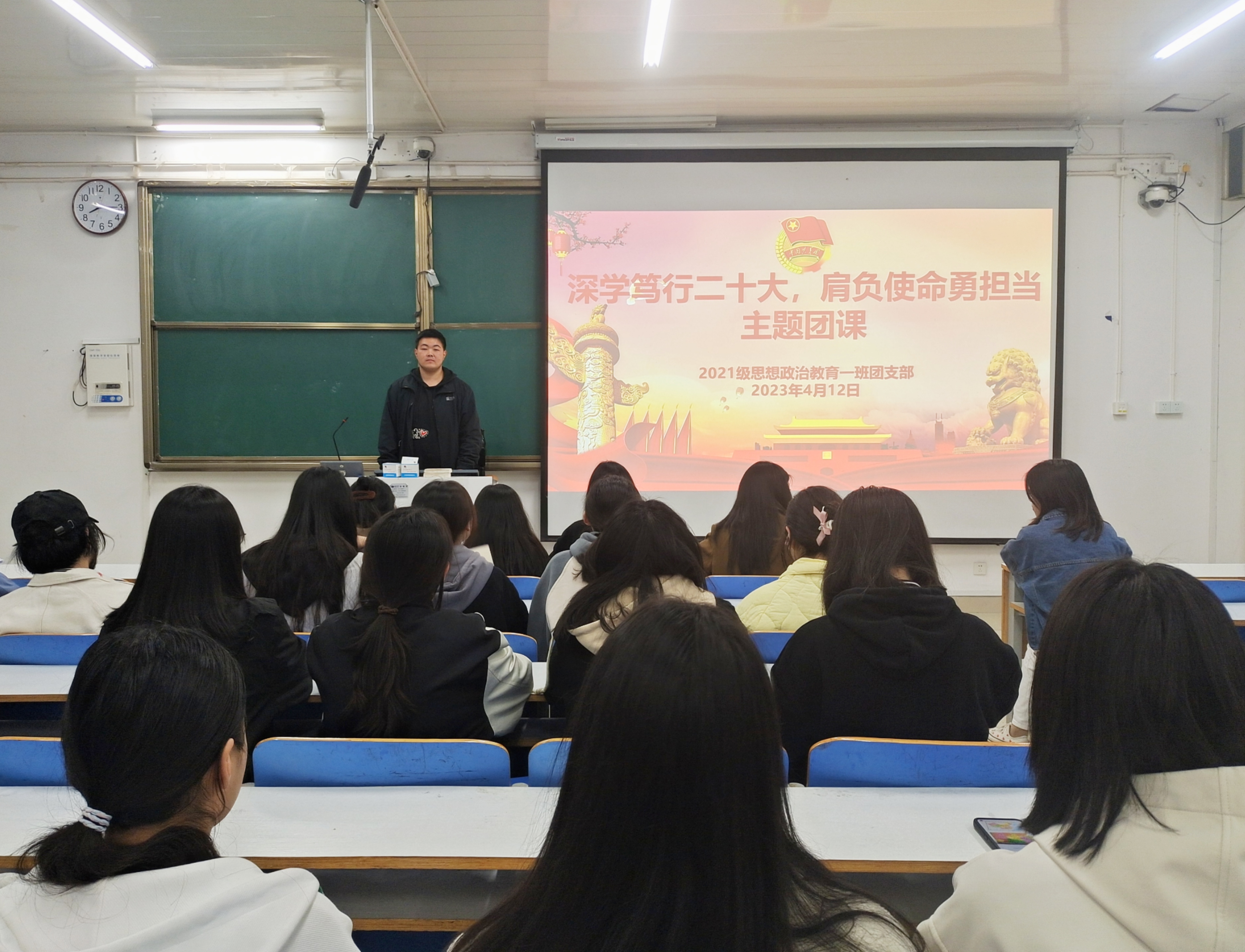 为强化对青年团员的思想政治引领,引导动员青年团员学习党的二十大精神,坚定跟党走,建功新时代,4月12日晚上,2021级思想政治教育一班在社科楼514教室召开“学习笃行二十大,肩负使命勇担当”主题团课。2021级思想政治教育一班全体团员参加了本次团课。团课由团支书戴翰林主持。