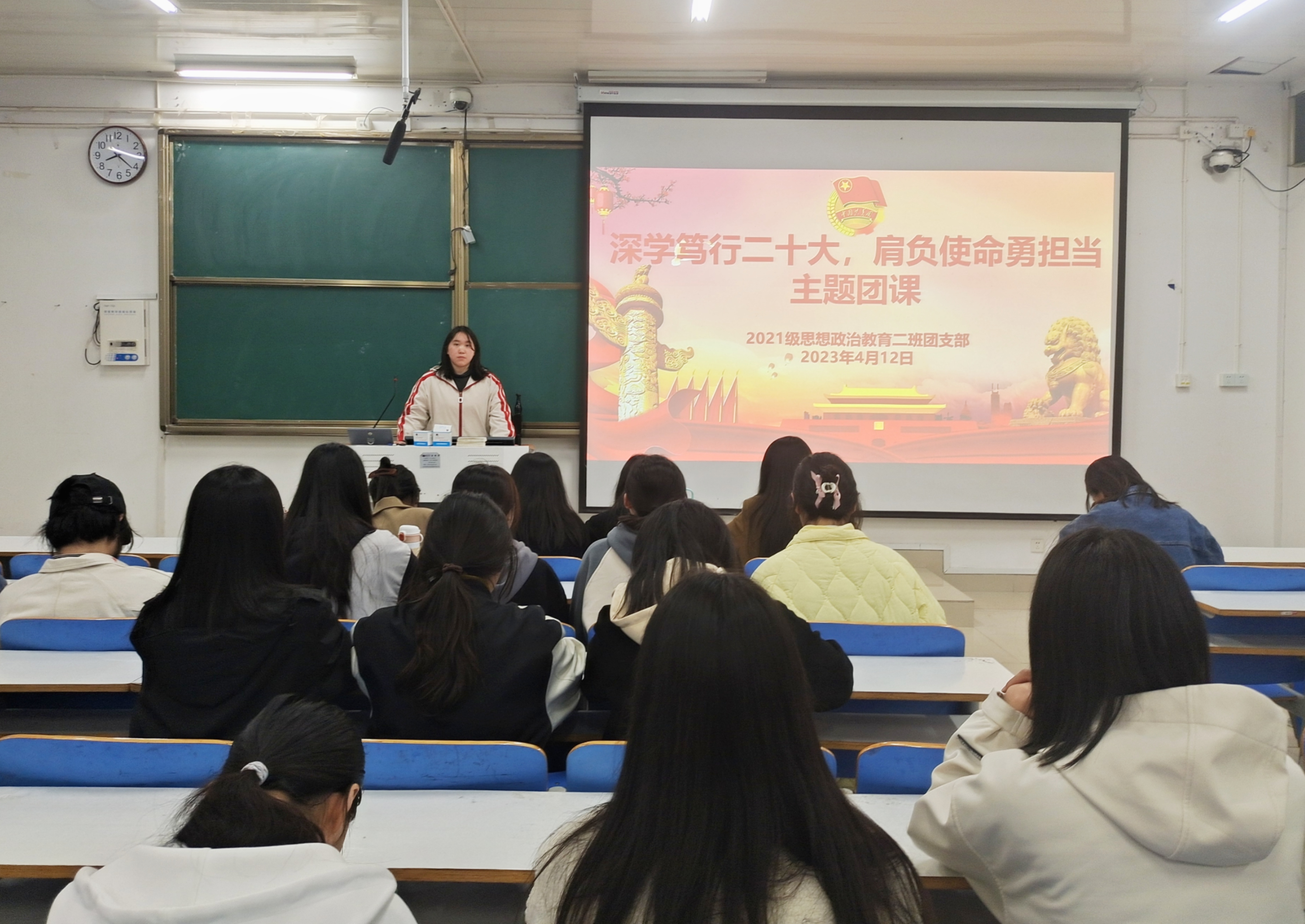 4月12日下午,2021级思想政治教育二班在社科楼514教室召开“深学笃行二十大,肩负使命勇担当”主题团课。2021级思想政治教育二班全体团员参加此次团课。团课由团支书王婧欣主持。