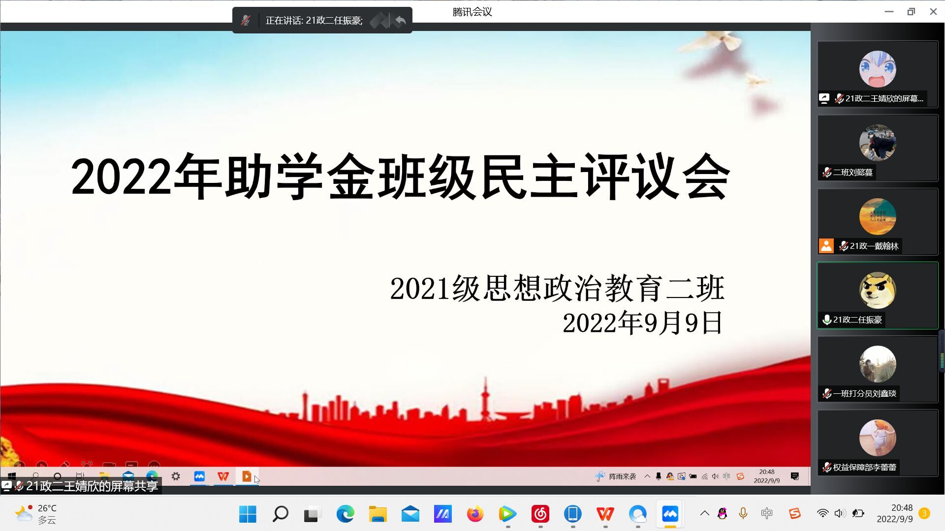 9月9日晚上,2021级思想政治教育二班在腾讯会议召开线上2022年助学金班级民主评议会。2021级思想政治教育二班评议小组成员及辅导员曹菁菁参加此次会议。会议由团支书王婧欣主持。