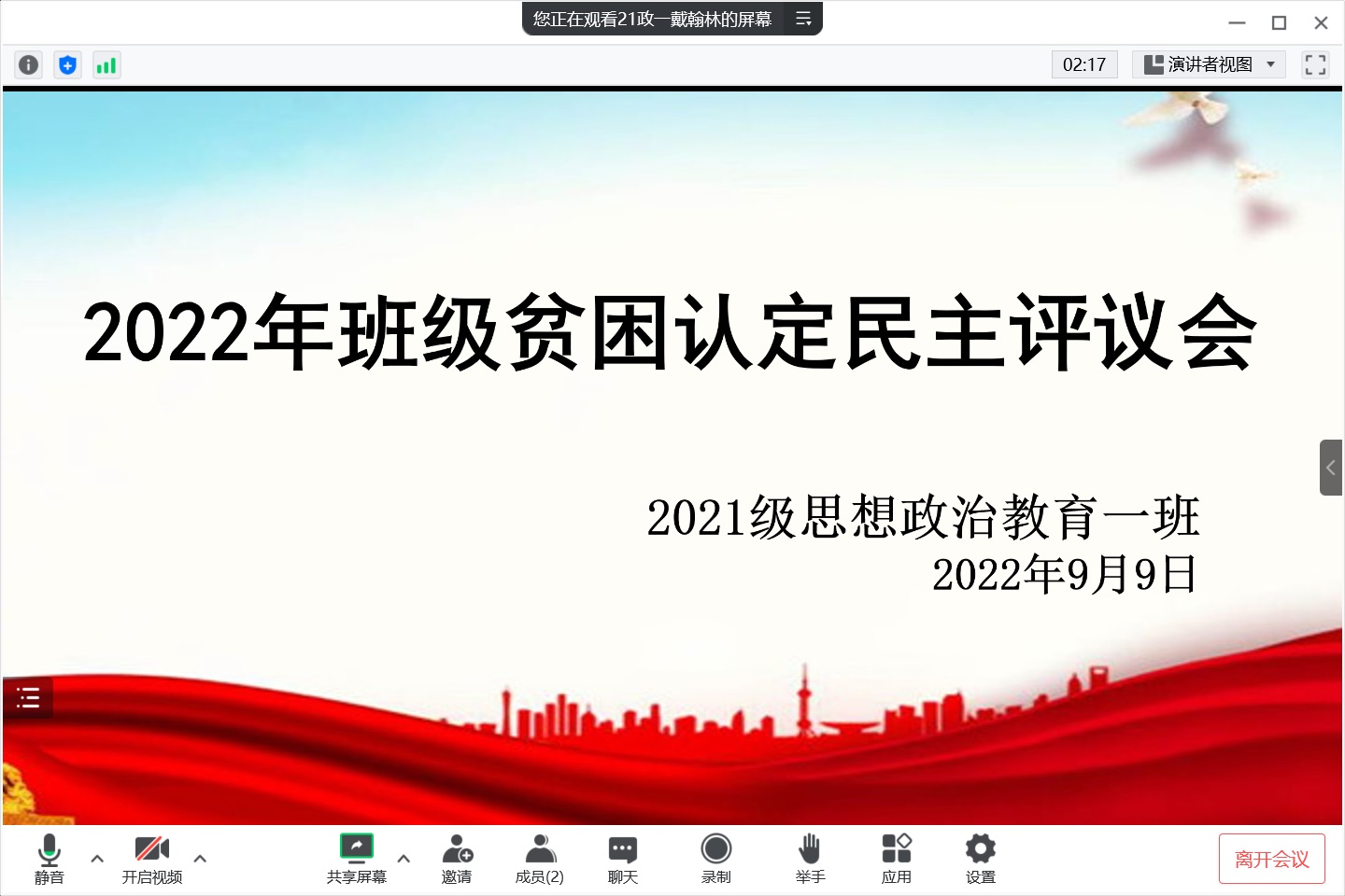 9月9晚上,2021级思想政治教育一班在腾讯会议召开线上2022年班级贫困认定民主评议会。评议会由辅导员曹菁菁、员工会权益保障部成员及2021级思想政治教育二班评议小组成员参加。评议会由班长戴翰林主持。