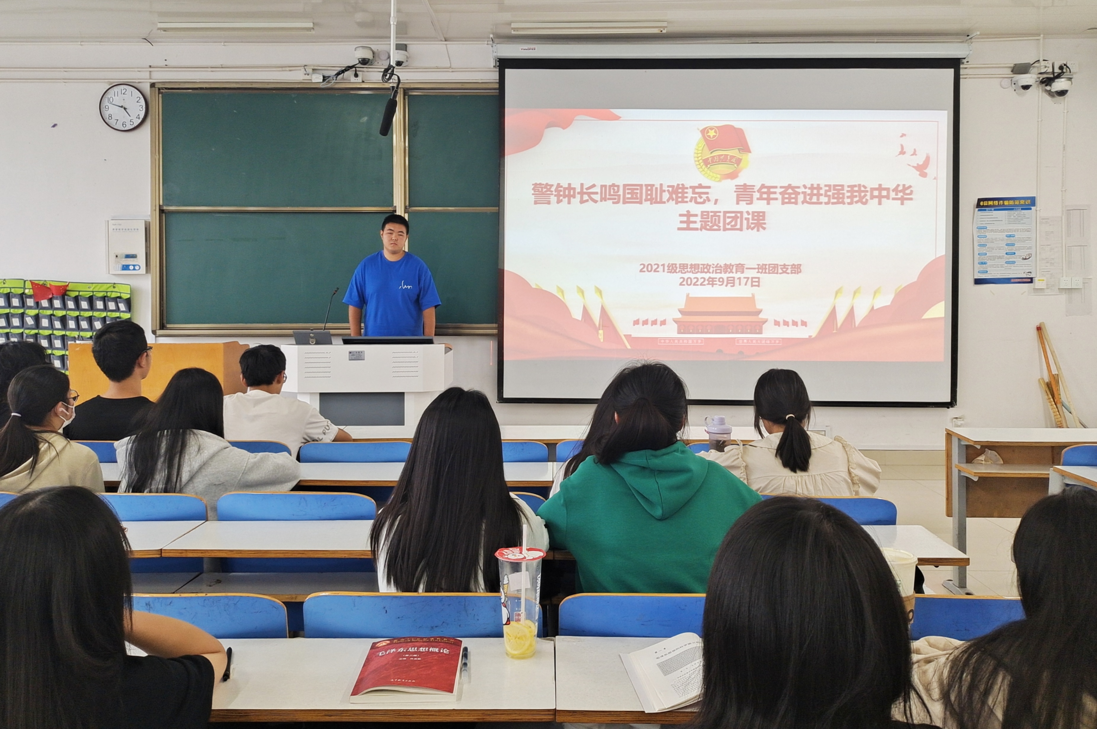 9月17日下午,2021级思想政治教育一班在社科楼514教室召开“警钟长鸣国耻难忘,青年奋进强我中华”主题团课。2021级思想政治教育一班全体团员共同参加了本次团课,团课由团支书戴翰林主持。
