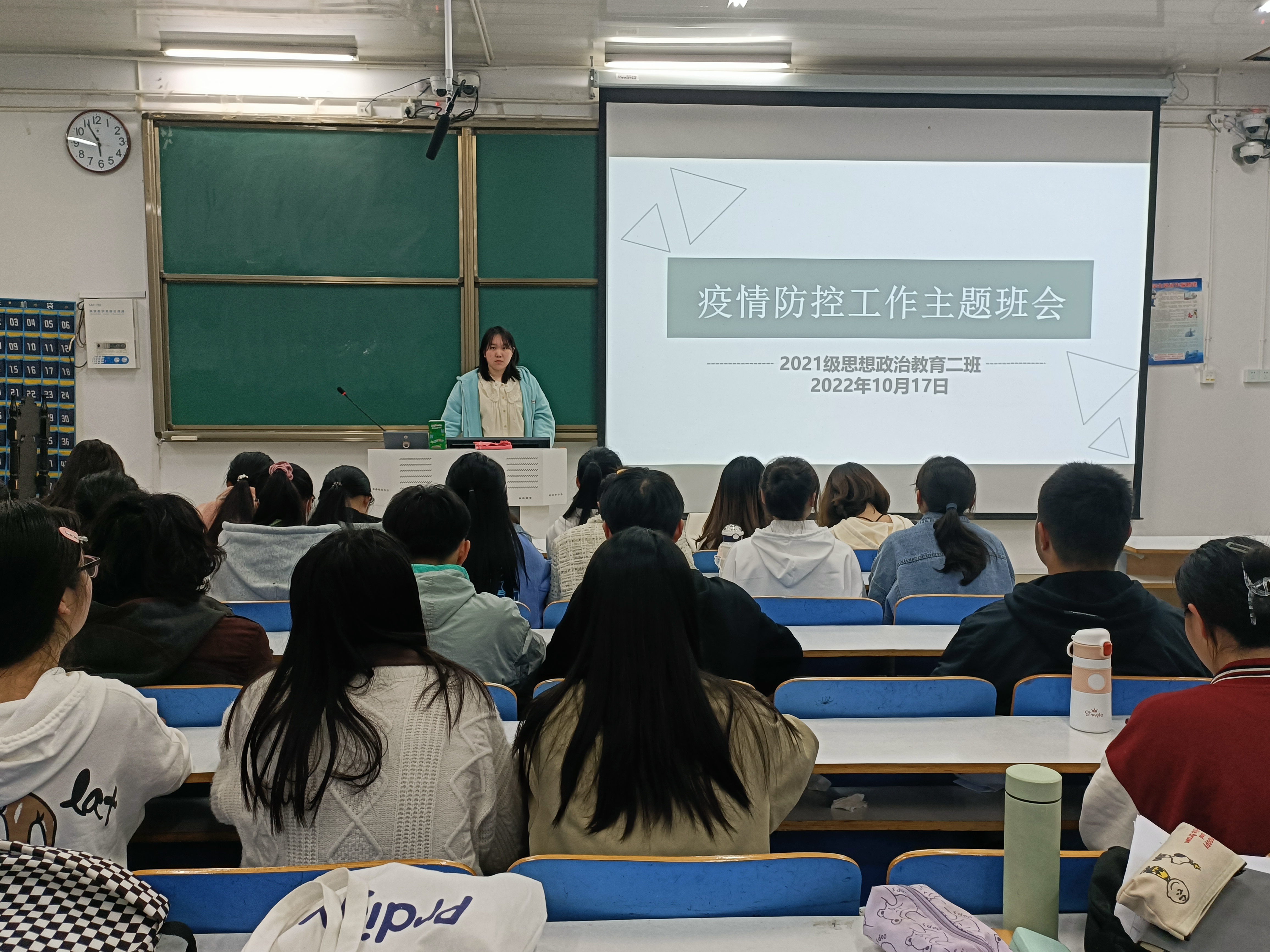 10月17日上午,2021级思想政治教育二班在社科楼514教室召开疫情防控工作主题班会。2021级思想政治教育二班全体成员参加此次班会。班会由团支书王婧欣主持。