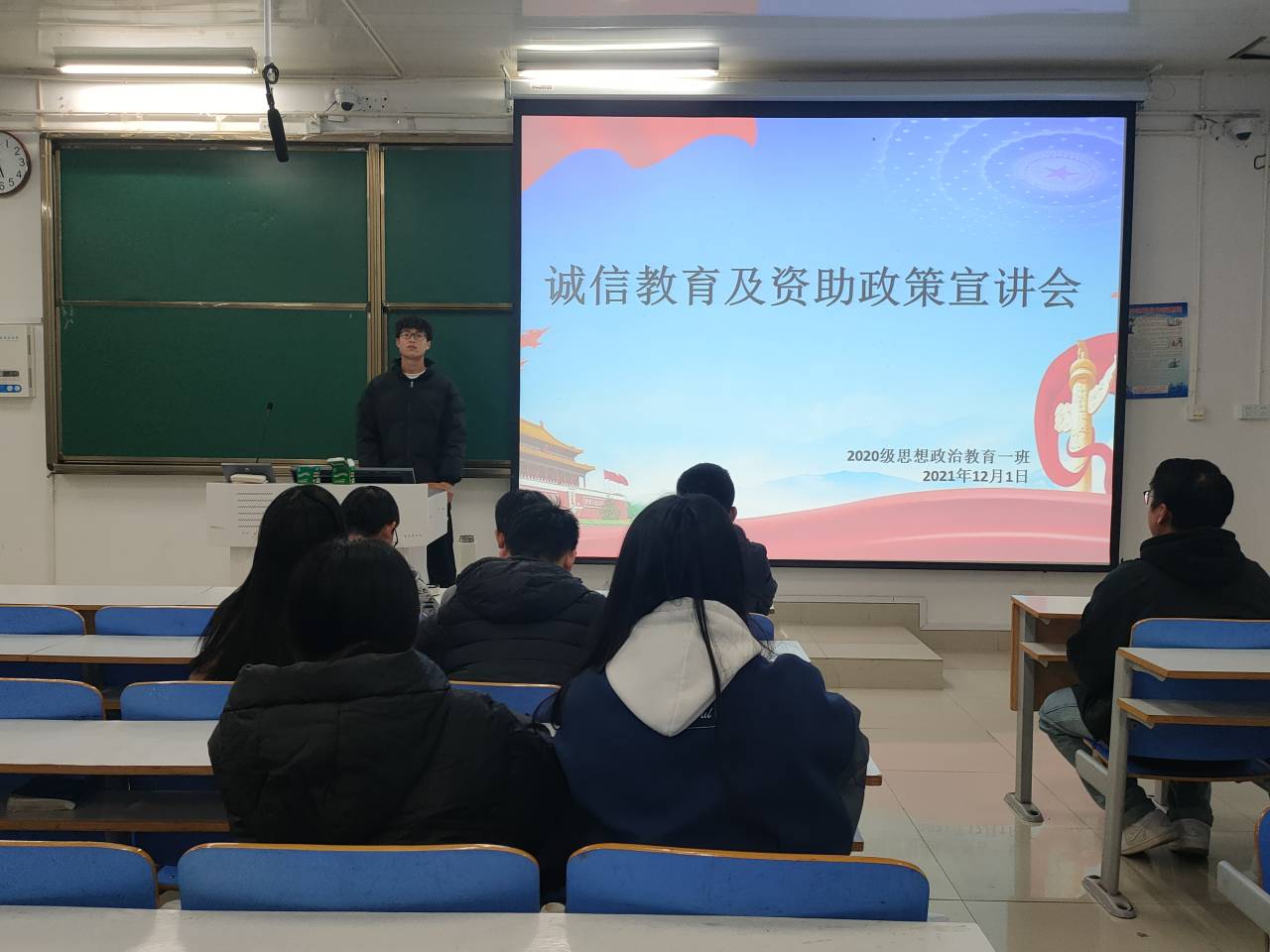 12月1日,2020级思想政治教育一班在社科楼514教室顺利召开“诚信教育及资助政策”宣讲会。2020级思想政治教育一班全体同学参加本次会议,宣讲会由副班长白帅豪主持。