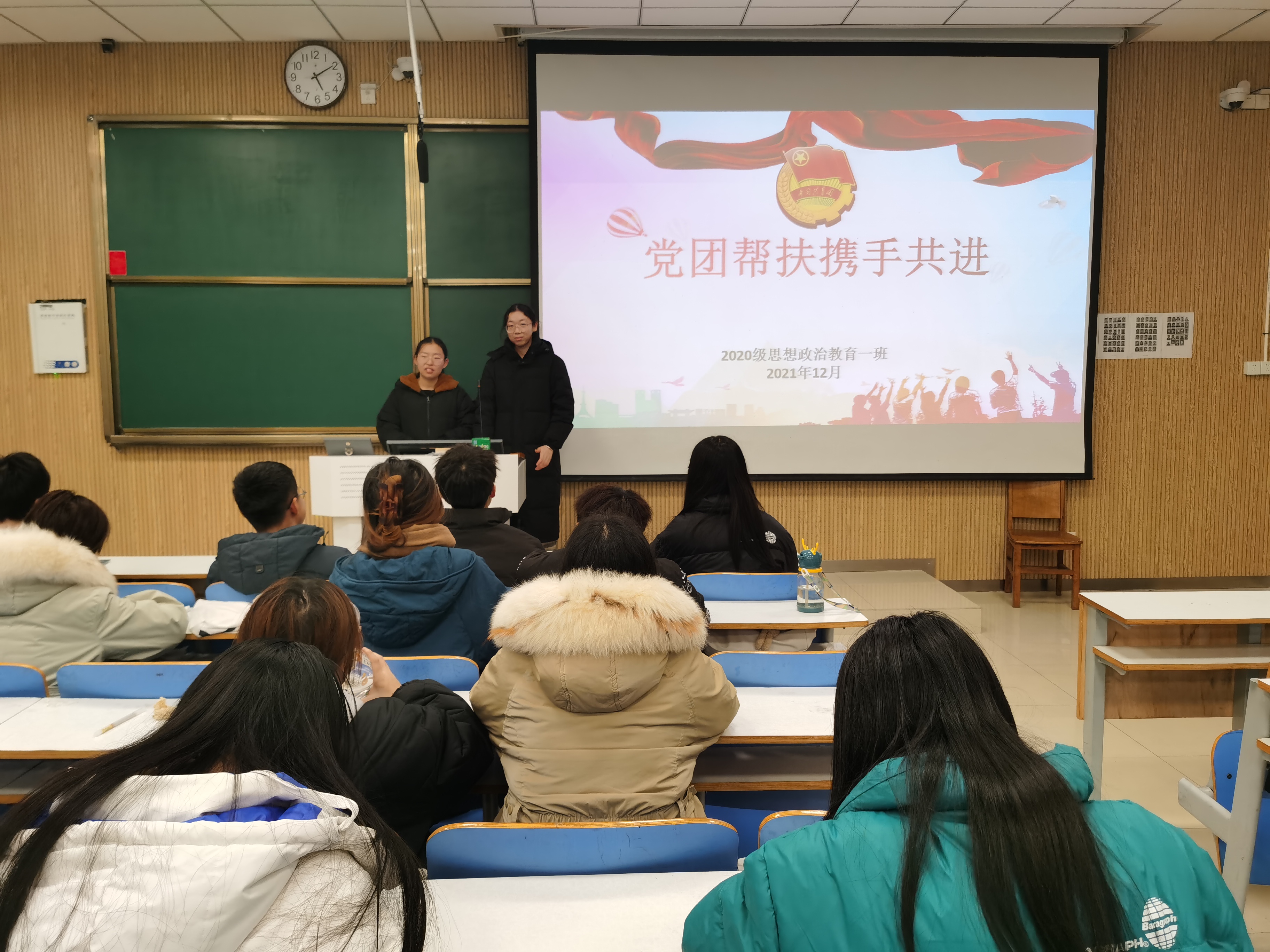 12月8日下午,2020级思想政治教育一班在社科楼515教室顺利开展党团帮扶活动。公司正式党员王涵、预备党员卞晓莹与2020级思想政治教育一班全体同学参加了本次活动。
