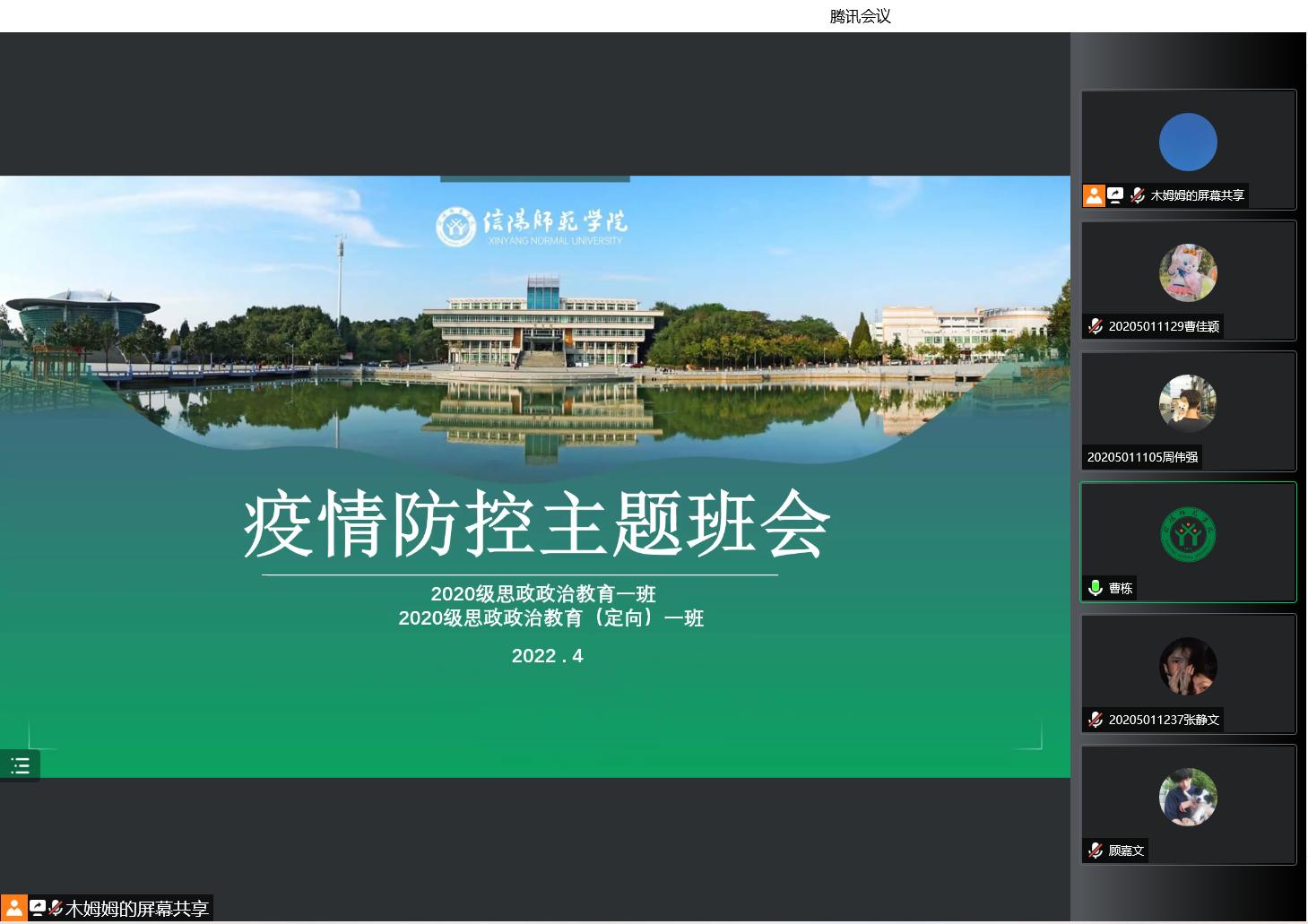 4月3日晚上,2020级思想政治教育一班、定向一班在腾讯会议上顺利召开疫情防控主题班会。2020级思想政治教育一班、定向一班全体同学参加此次会议,会议由辅导员曹栋主持。