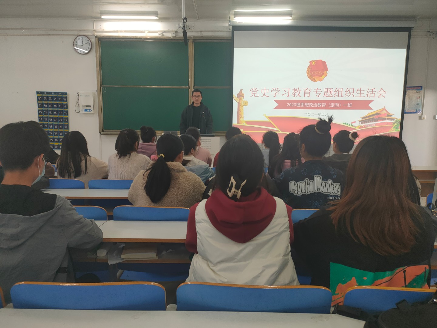 11月11日上午,2020级思想政治教育定向一班党史学习教育专题组织生活会在社科楼514教室顺利召开。辅导员曹栋及2020级思想政治教育定向一班全体员工共同参加本次会议。