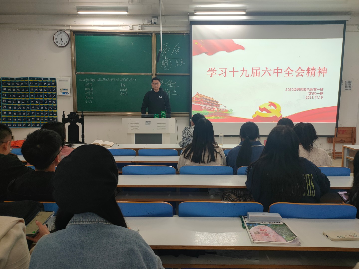 11月19日下午,2020级思想政治教育一班、定向一班在社科楼516教室开展“学习十九届六中全会精神”主题团课。2020级思想政治教育一班、定向一班全体成员参加本次团课。