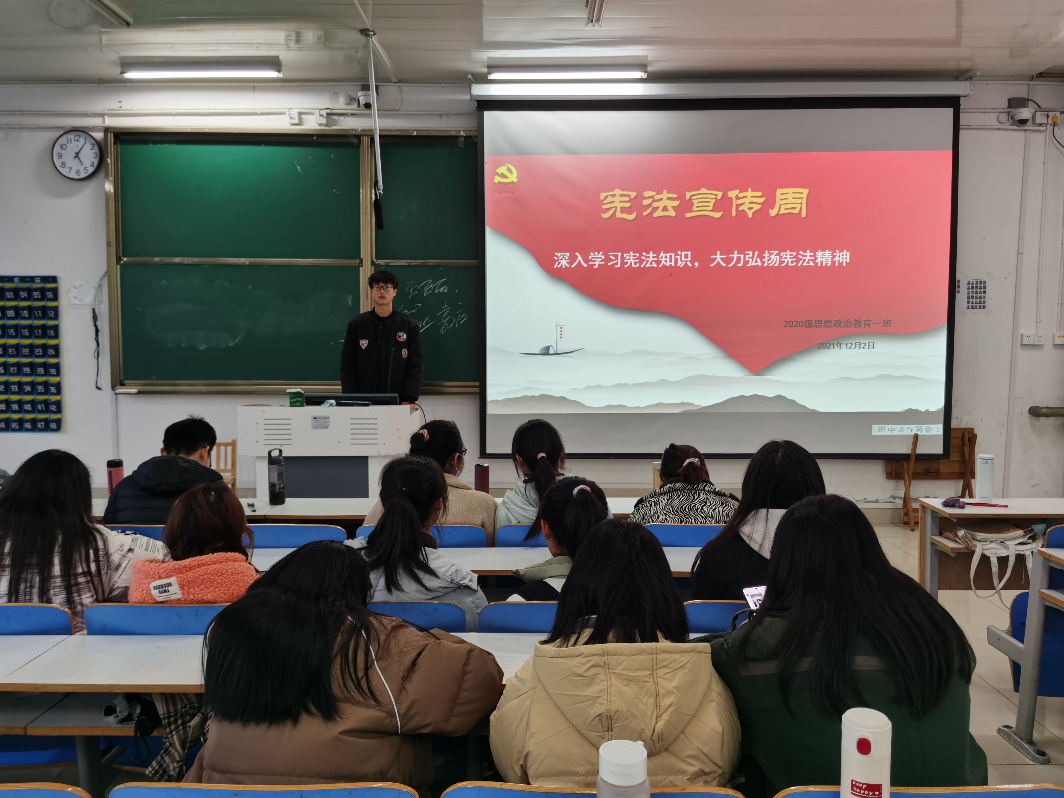 为增强同学们的法治观念,培养法治思维,12月2日下午,2020级思想政治教育一班在社科楼516教室召开“深入学习宪法知识,大力弘扬宪法精神”主题班会。
