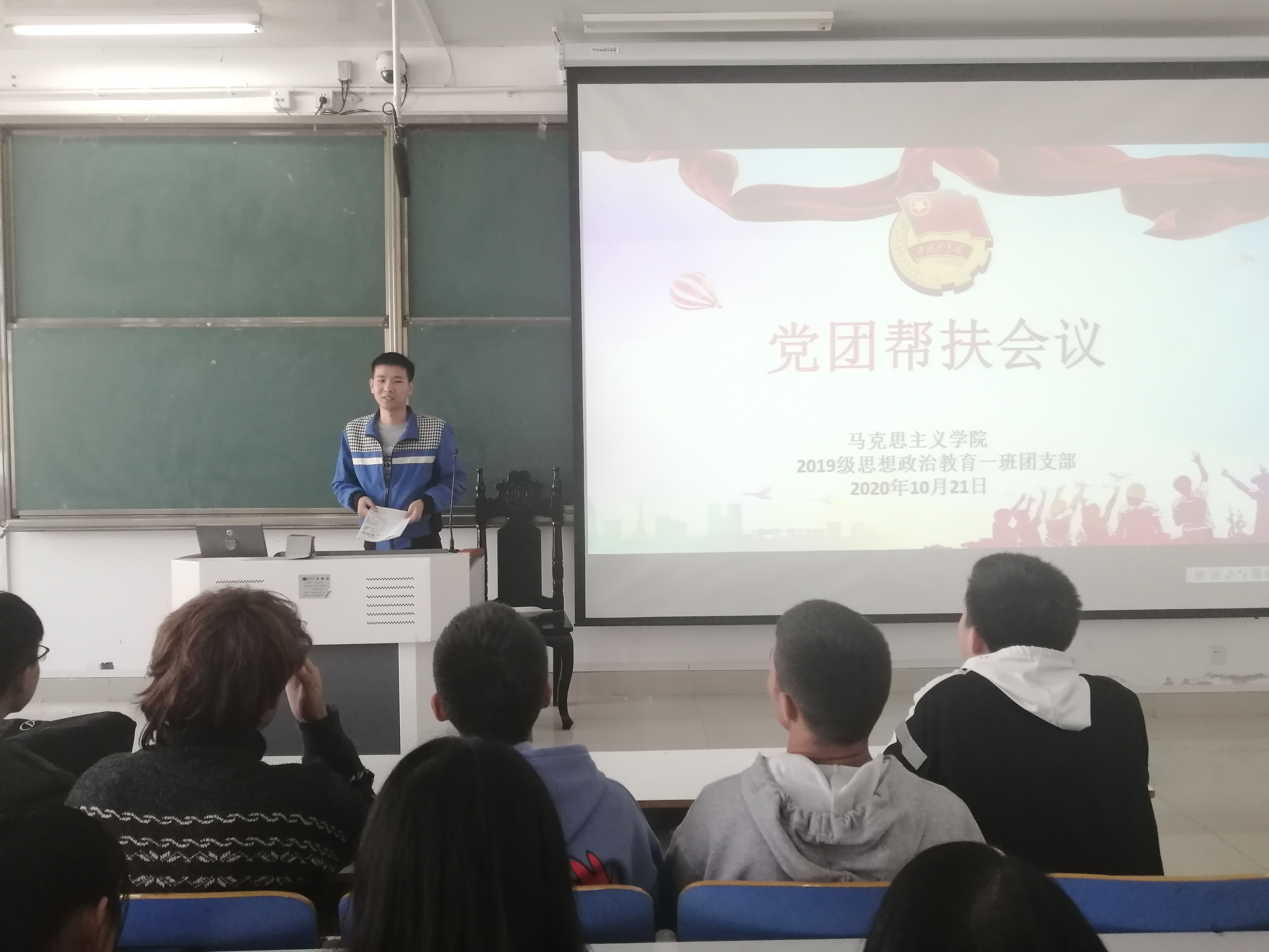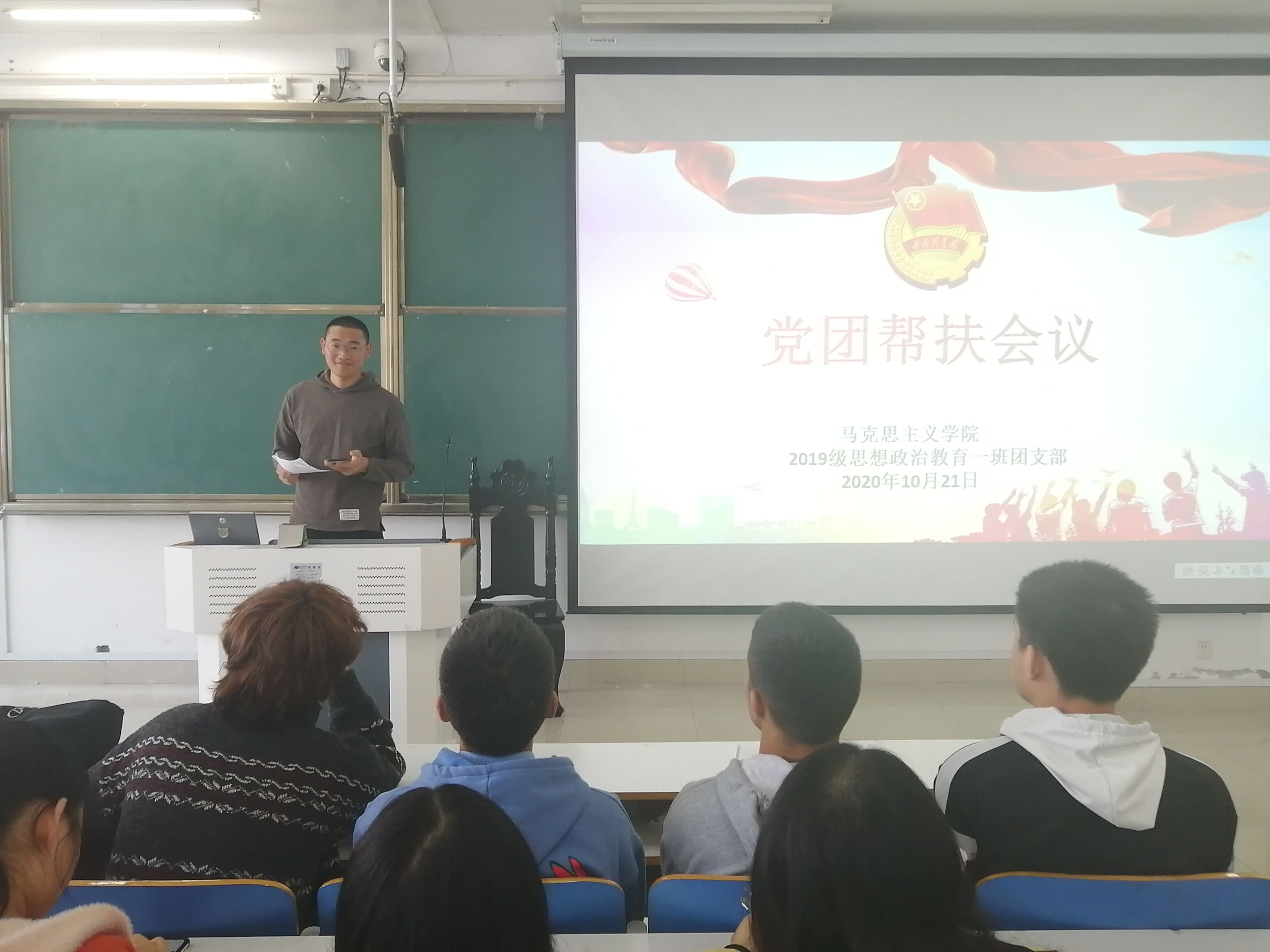 10月21日上午,2019级思想政治教育一班在社科楼514教室召开党团帮扶会。2019级思想政治教育一班全体成员参加本次会议,由团支书贾子漪主持。