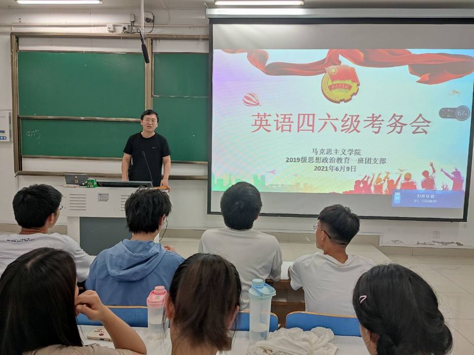 6月9日下午,2019级思想政治教育一班在社科楼515教室召开英语四六级考务会。2019级思想政治教育一班全体成员参加本次考务会。考务会由辅导员曹栋主持。