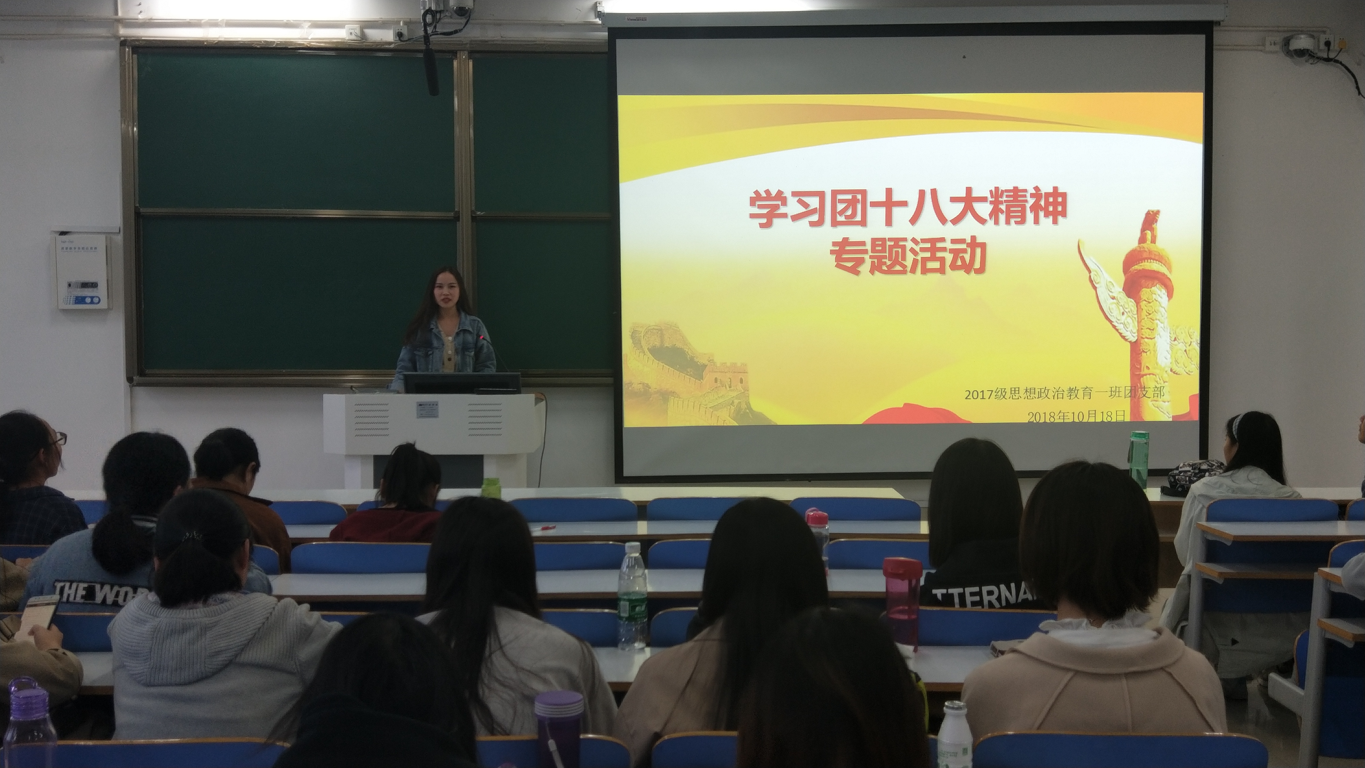 为加强员工的思想建设,发挥团员骨干引领作用,激励广大青年学子在团学精神的指导中勤奋学习、立志成才,做新时代的奋斗者, 10月19日下午,2017级思想政治教育一班在社科楼514教室组织开展“学习团十八大精神”活动,全班同学积极参与。