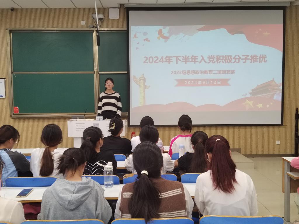 为协助党组织吸纳优秀员工,为党组织增添新活力,9月12日上午,XCSport2023级思想政治教育二班在社科楼515教室开展2024年下半年入党积极分子推优大会。本次推优大会由团支书王慜初主持,全体二班同学参加。