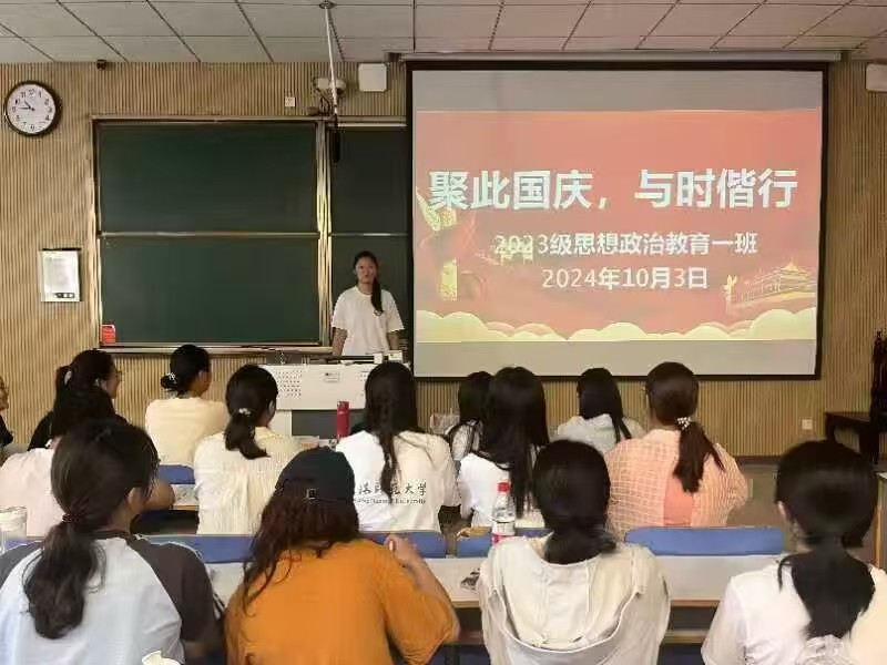 为深入学习贯彻习近平新时代中国特色社会主义思想,激发我班学子的爱国情怀和使命担当,10月3日上午,XCSport2023级思想政治教育一班在社科楼515教室召开“聚此国庆,与时偕行”主题团课。2023级思想政治教育一班全体同学参与本次团课,团课由团支书张卓主持。