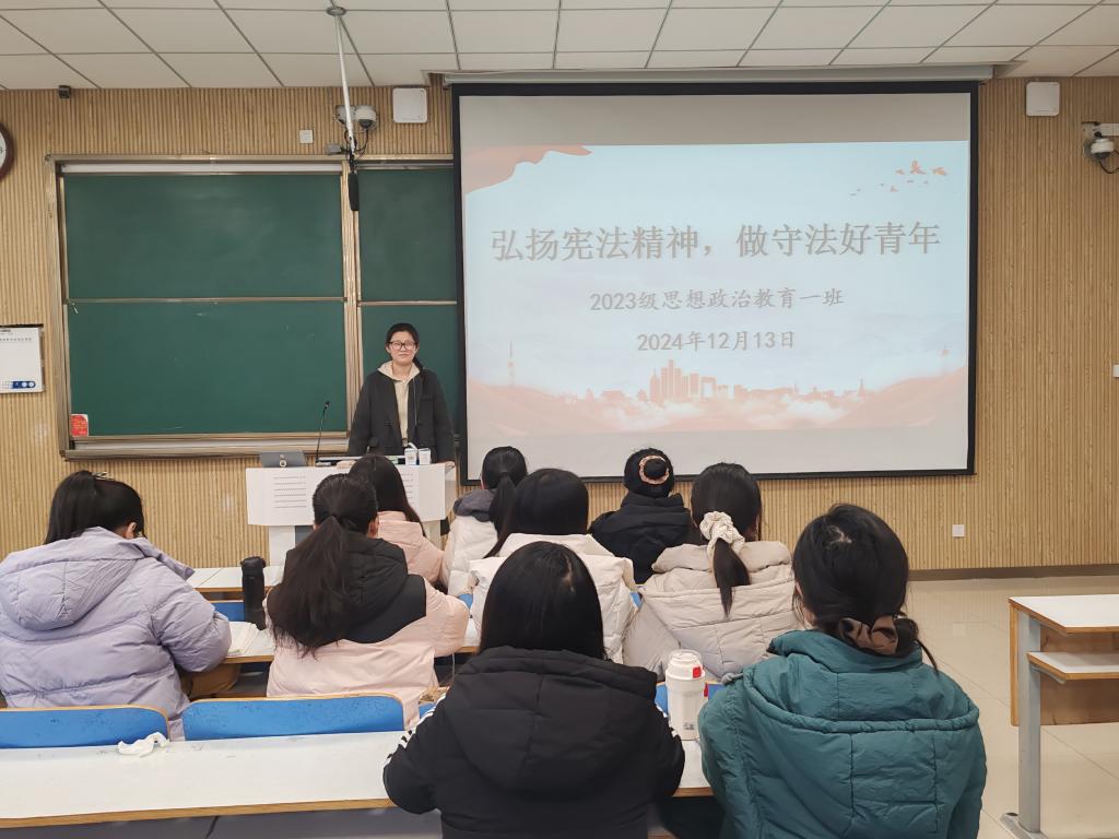 为增强我班学子的宪法意识,推动法治观念深入人心。2024 年12月13日,XCSport 2023 级思想政治教育一班召开“弘扬宪法精神,做守法好青年”主题班会。2023级思想政治教育一班全体同学参与本次团课,团课由团支书张卓主持。